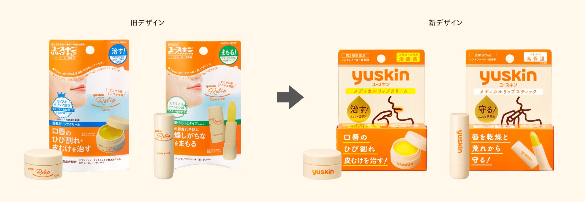 1988年に販売を開始し、根強いユーザーに愛されてきたリップブランド「ユースキン リリップ」も、更なるファンの拡大と製品の強みをより訴求するため、パッケージデザインをリニューアル。ブランド名を「ユースキン メディカルリップ」に変更し、効能の強みを伝えると共に、旗艦製品である「ユースキン」ブランドとしてデザインを統一。パッケージデザインでは、第3類医薬品の治療効果「治す」と医薬部外品の予防効果「守る」をしずくアイコンで表示し、口元のイラストを入れることで唇荒れに悩む人々に直感的に届くデザインとしています。8月1日の販売開始から、出荷数や販売店舗も好調に推移しています。