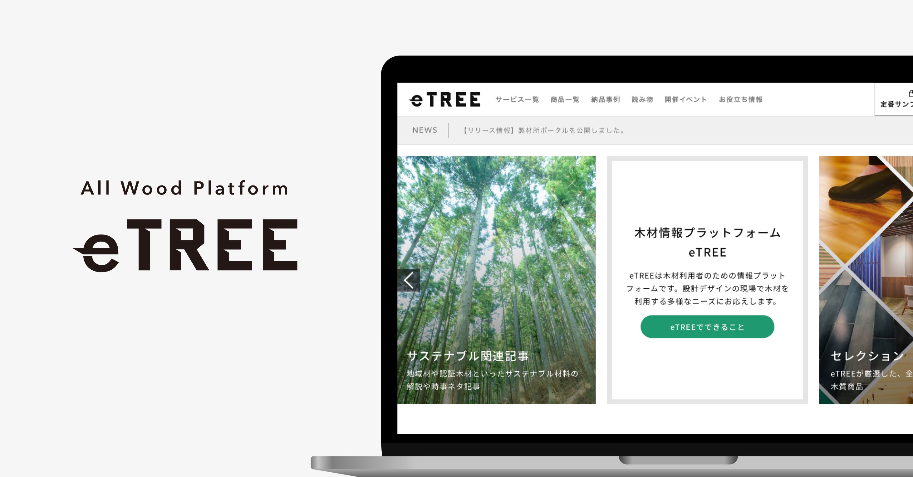eTREEは設計者・デザイナー・建設事業者様向けの、木材情報プラットフォームです。全国の商品情報や補助金情報、イベントなど、木材を利用する際に役立つ情報を提供し、木材を利用する多様なニーズにお応えしています。