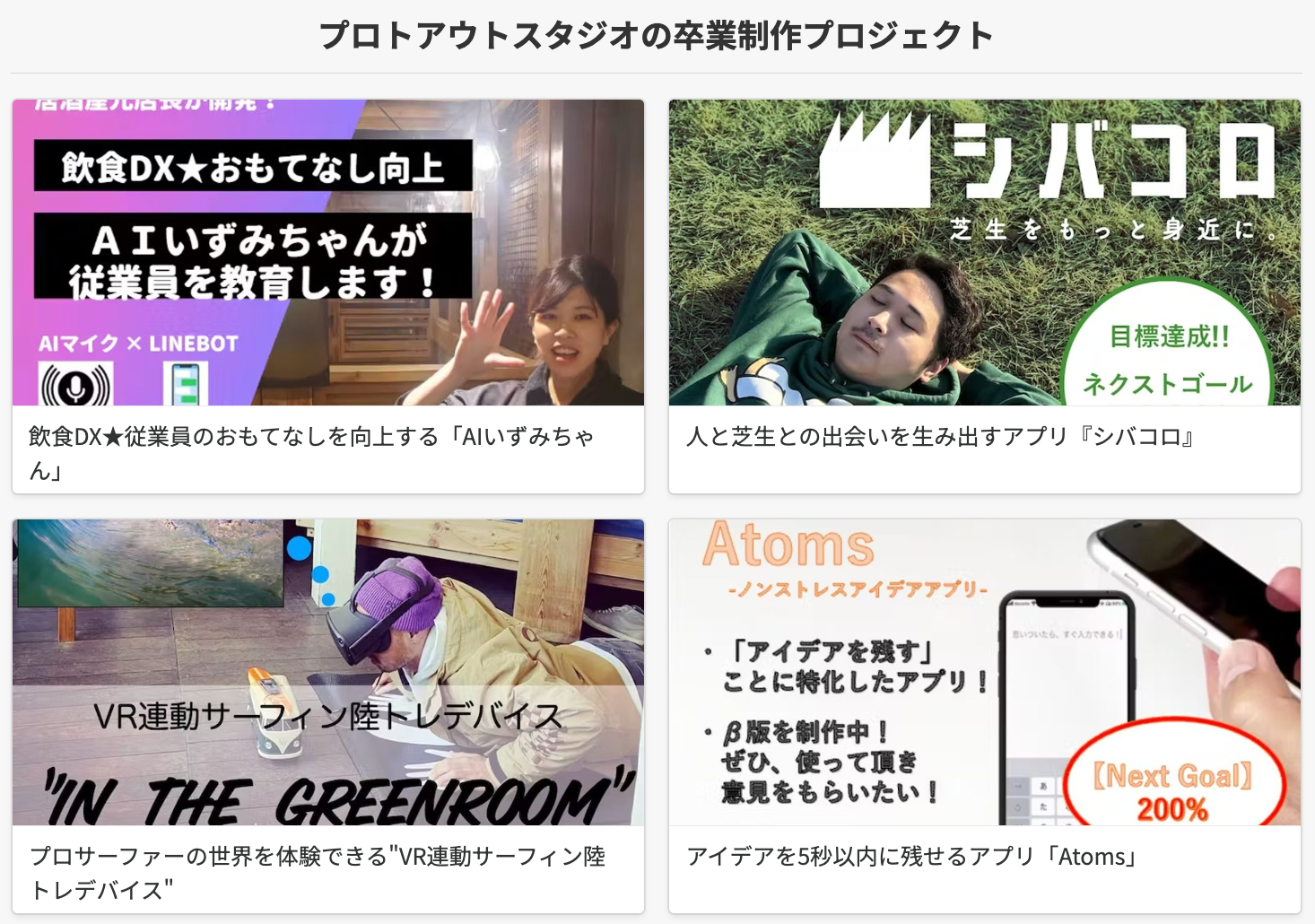 プロトアウトスタジオは、プログラミングとプランニング(企画)の両方のスキルを兼ね備えた人材輩出を行う日本初のプロトタイピング専門スクールです。テクノロジーを学ぶ機会は増えていますが、テクノロジーを勉強したという事象だけには価値が無くなりつつあります。