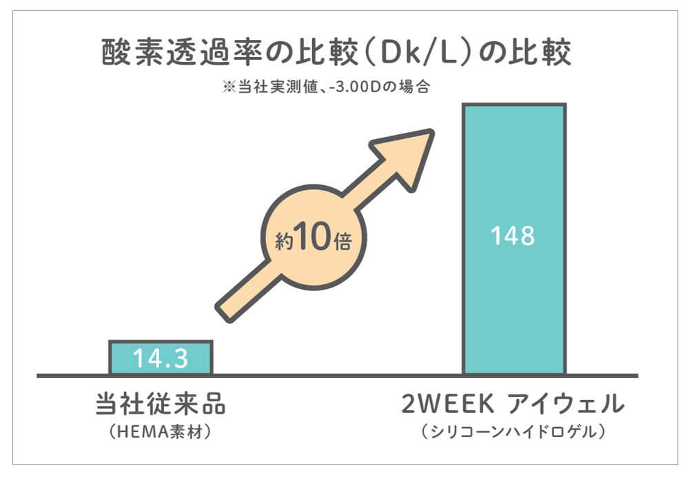レンズの素材に酸素透過性が高い、シリコーンハイドロゲル素材を採用。従来素材HEMAと比較して、約10倍の酸素を瞳に届け、瞳への負担を軽減します。(当社従来品比)また、シリコーンハイドロゲル素材特有の硬さをやわらげ、着け心地も向上しています。