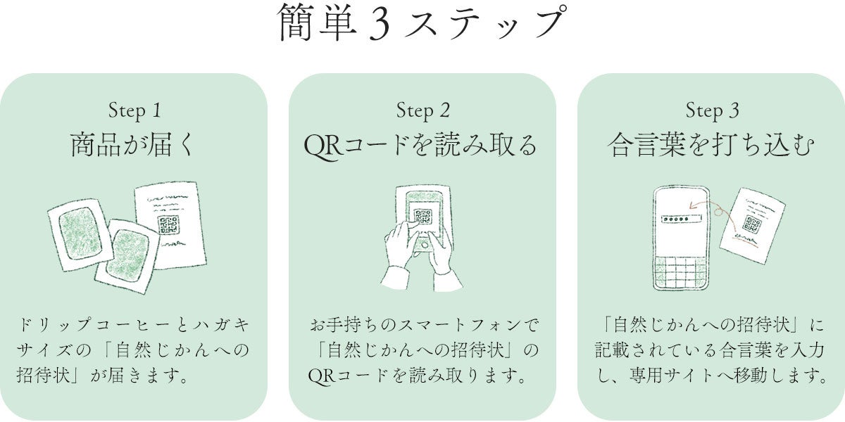 ドリップコーヒーと一緒に届く「自然じかんへの招待状」のQRコードを読み込み、パスワードを入力することで秘密の専用サイトへ移動できます。