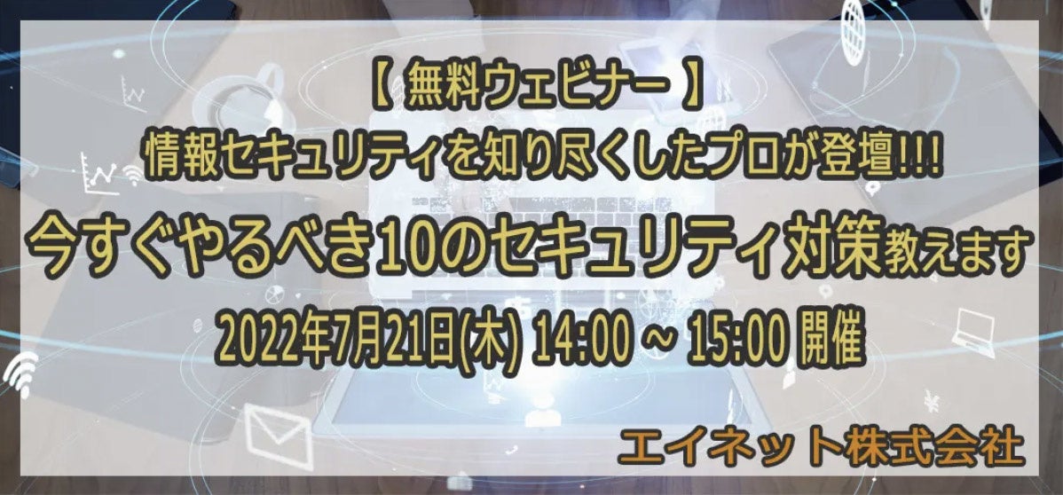 エイネット株式会社(東京都千代田区神田佐久間町3-23 スタウトビル3F 代表取締役 西畑博功)は、中小企業のセキュリティの課題とその対策方法をテーマに、一流の専門家講師を招いたウェビナーを7月21日に開催いたします。
