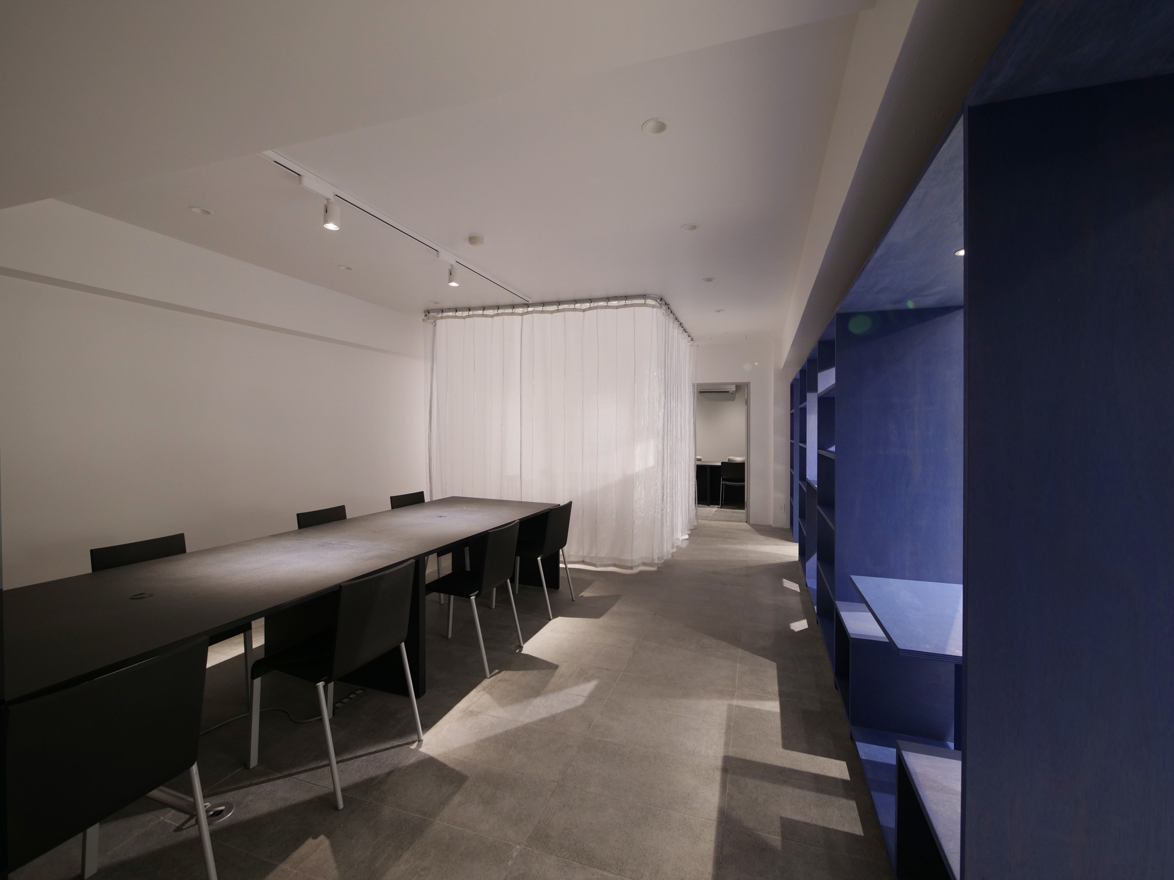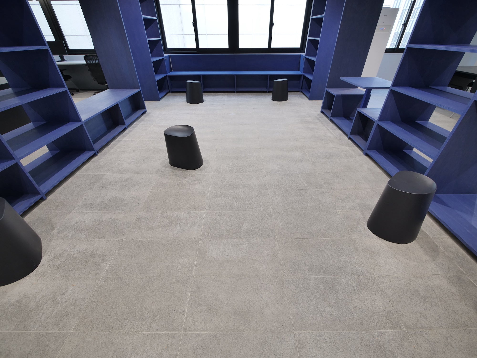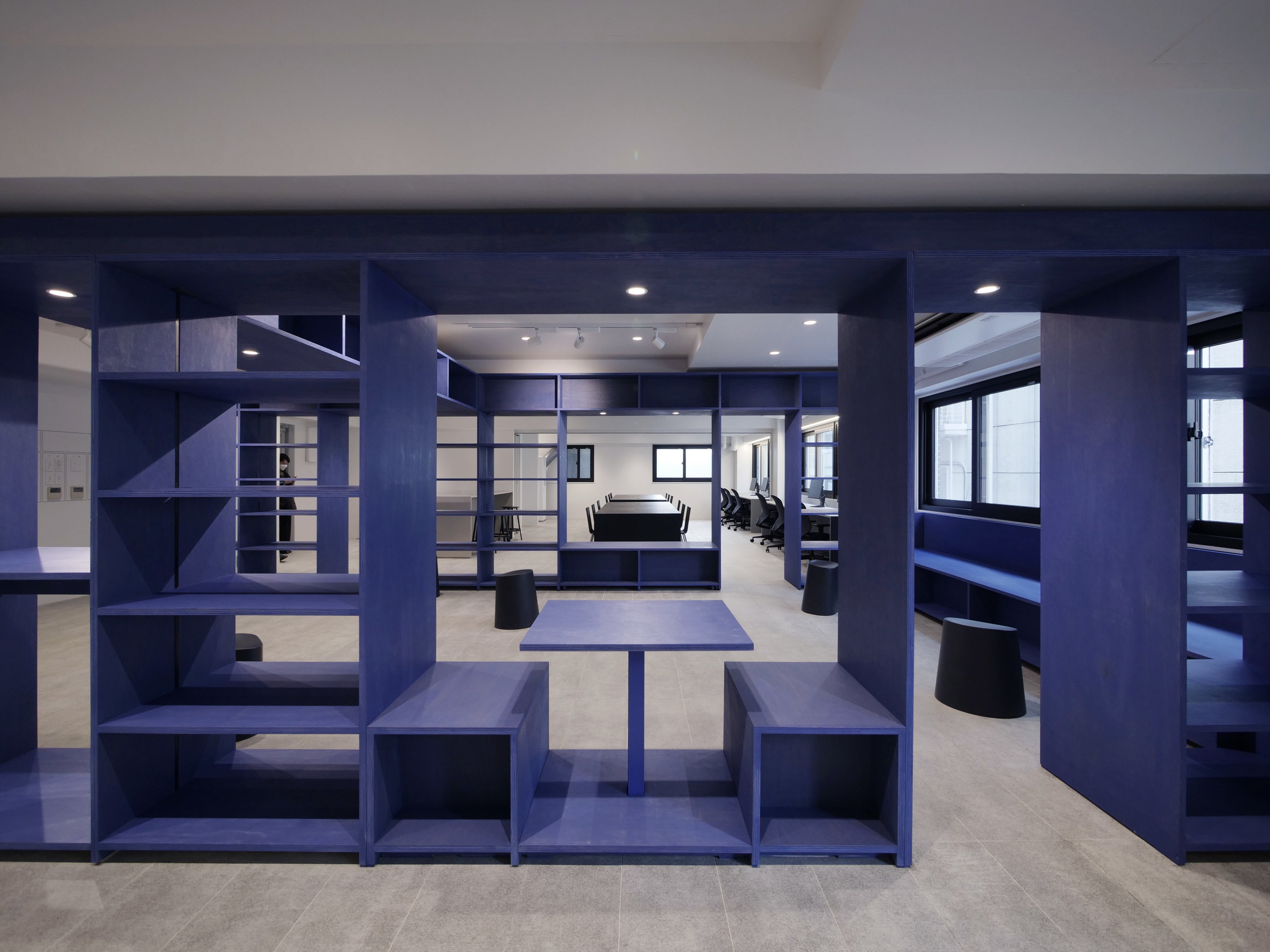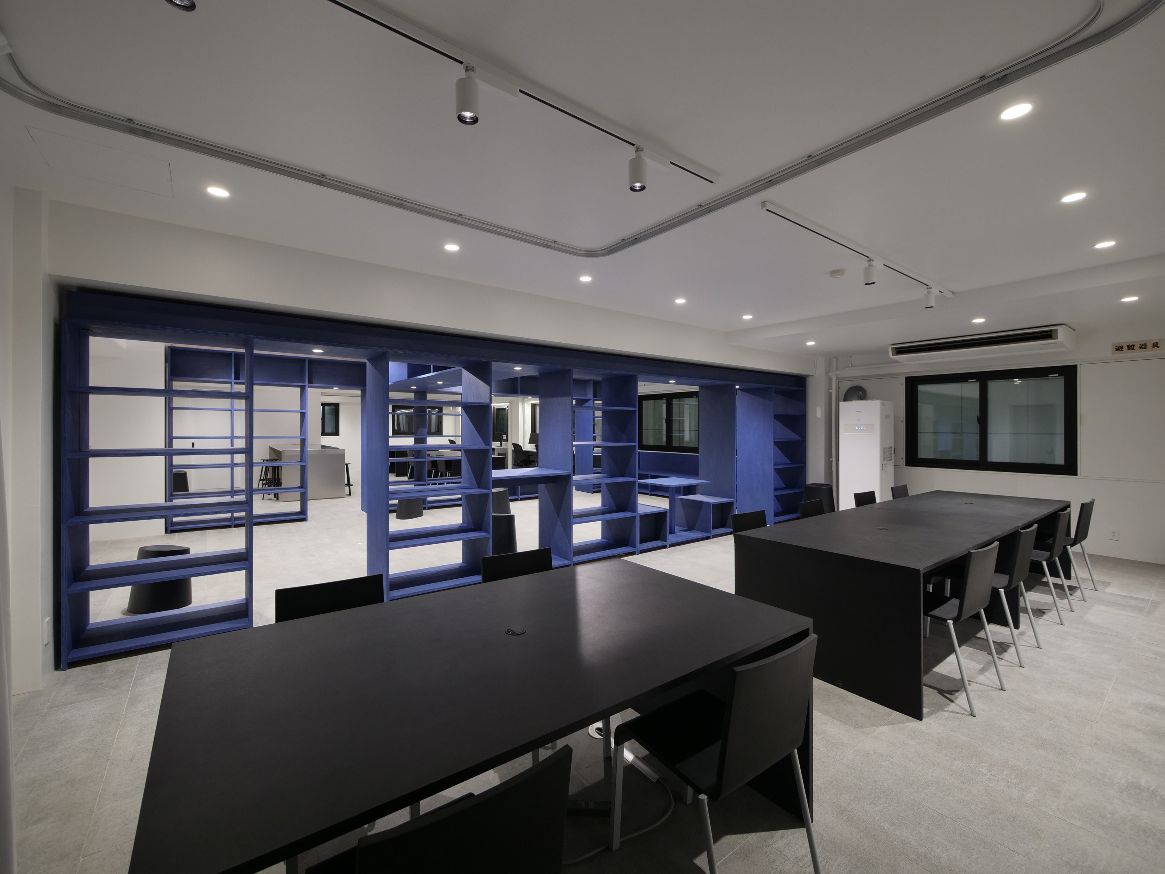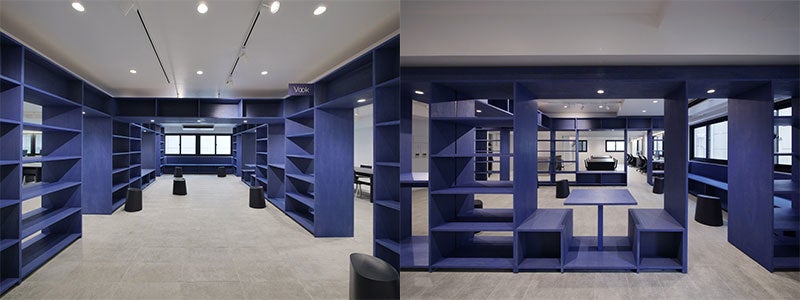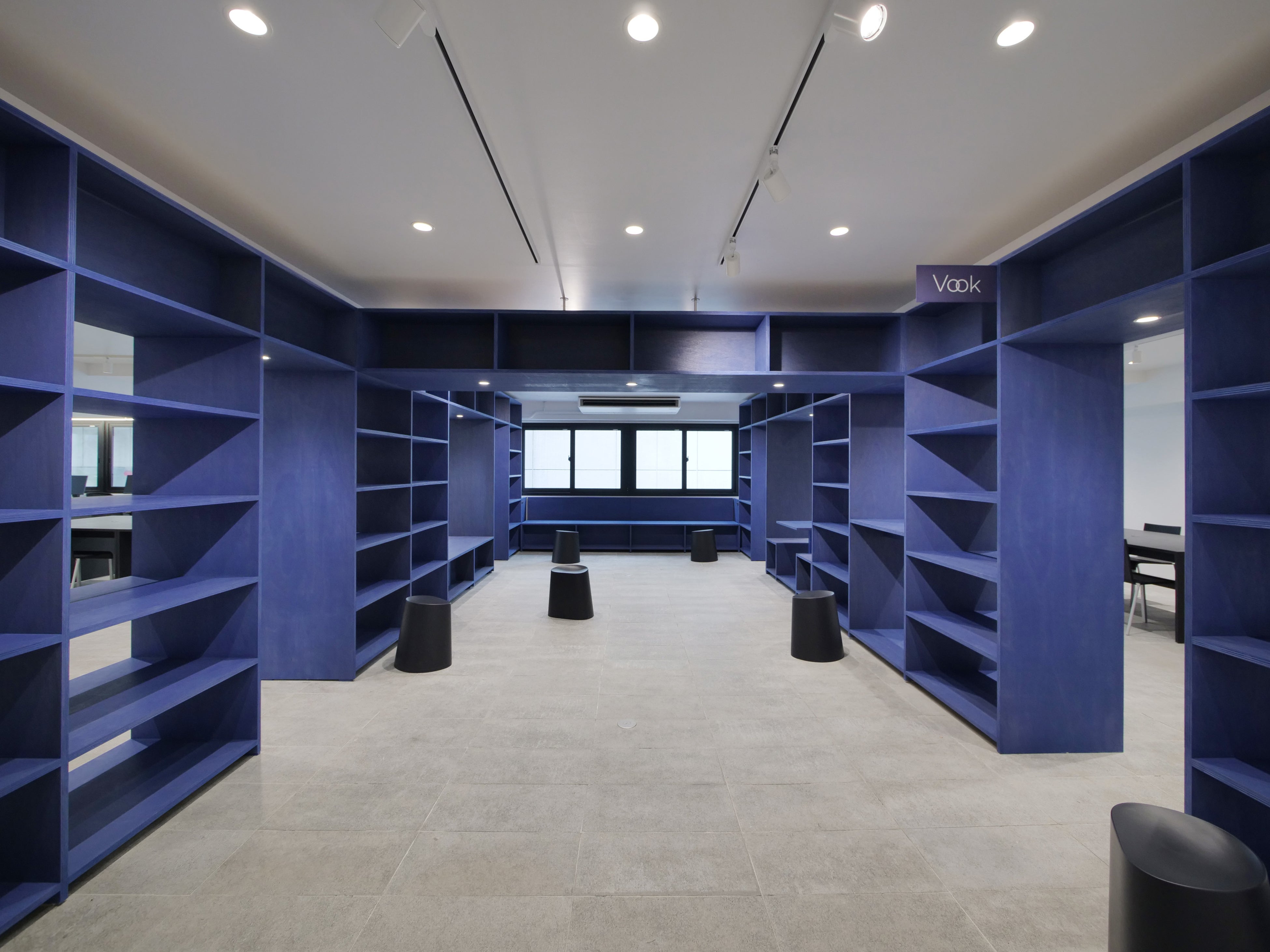 エントランスホールには映像クリエイターに関わる人々のためのライブラリースペースを設置。Vookのビジョンビジュアルから抽出した宇宙や空を連想させる色味を基調としています。