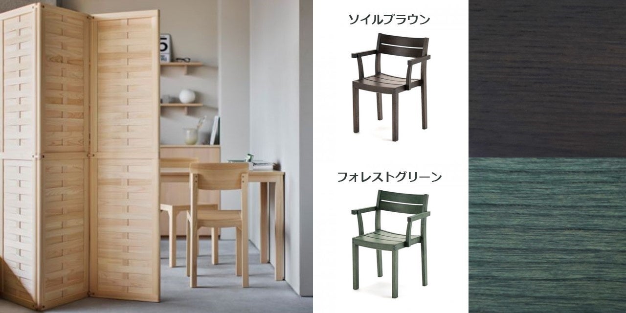 今月4月に 「カリモク家具」が、ミラノサローネで「MAS」シリーズの新作モデル3つ「DR チェア 01」「DR ダイニングテーブル 01」「VK ディバイダー」と新作カラーを発表。既存カラーの「ヒノキキナリ」に加え、新たに2色「ソイルブラウン」「フォレストグリーン」を「MAS」シリーズで展開。リグナは、他社に先駆けて実店舗やECサイトにて新作モデルや新作カラーの取り扱いを開始します。