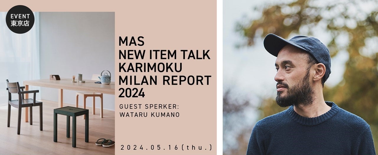 「カリモク家具」が手掛けるブランド「MAS」シリーズの新作発売に併せて、トークイベントを開催します。「MAS」のデザインディレクターである熊野亘氏と、「カリモク家具」の伊藤允彦氏をお招きし、今年4月に開催されたミラノサローネでの展示や現地の様子、ミラノでの反響などについてお伺いします。「リグナテラス東京」では、ミラノで発表された「MAS」シリーズの新作モデルを全国で一早く展示します。ドリンクを片手に、デザイナーと直接お話ができる貴重な機会となっておりますので、ぜひご来店ください。