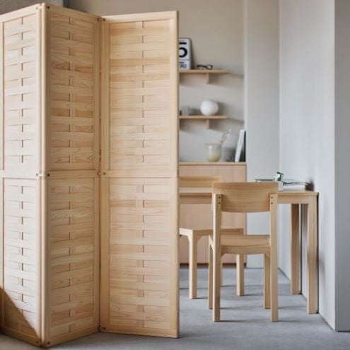 サステナブルなアプローチによって、製作された折り畳み式の間仕切り。パネル面には、工芸品などに見られる網代編み(あしろあみ)の技術が用いられています。開き具合を自由に調節できるため、様々な空間に対応します。折り畳めば、コンパクトになるので使わない時はちょっとした隙間に収納可能です。和テイストから北欧テイストまで幅広く合わせることができます。