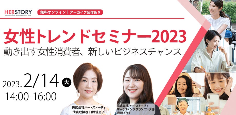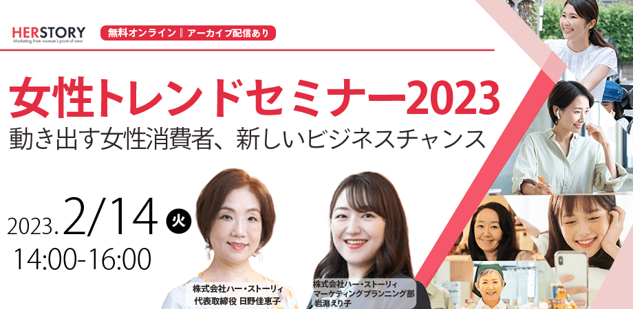 株式会社ハー・ストーリィ(本社:東京都港区、代表:日野佳恵子)は、2023年2月14日(火)オンラインにて「女性トレンドセミナー2023 〜動き出す女性消費者、新しいビジネスチャンス〜」を開催します。参加費は無料です。