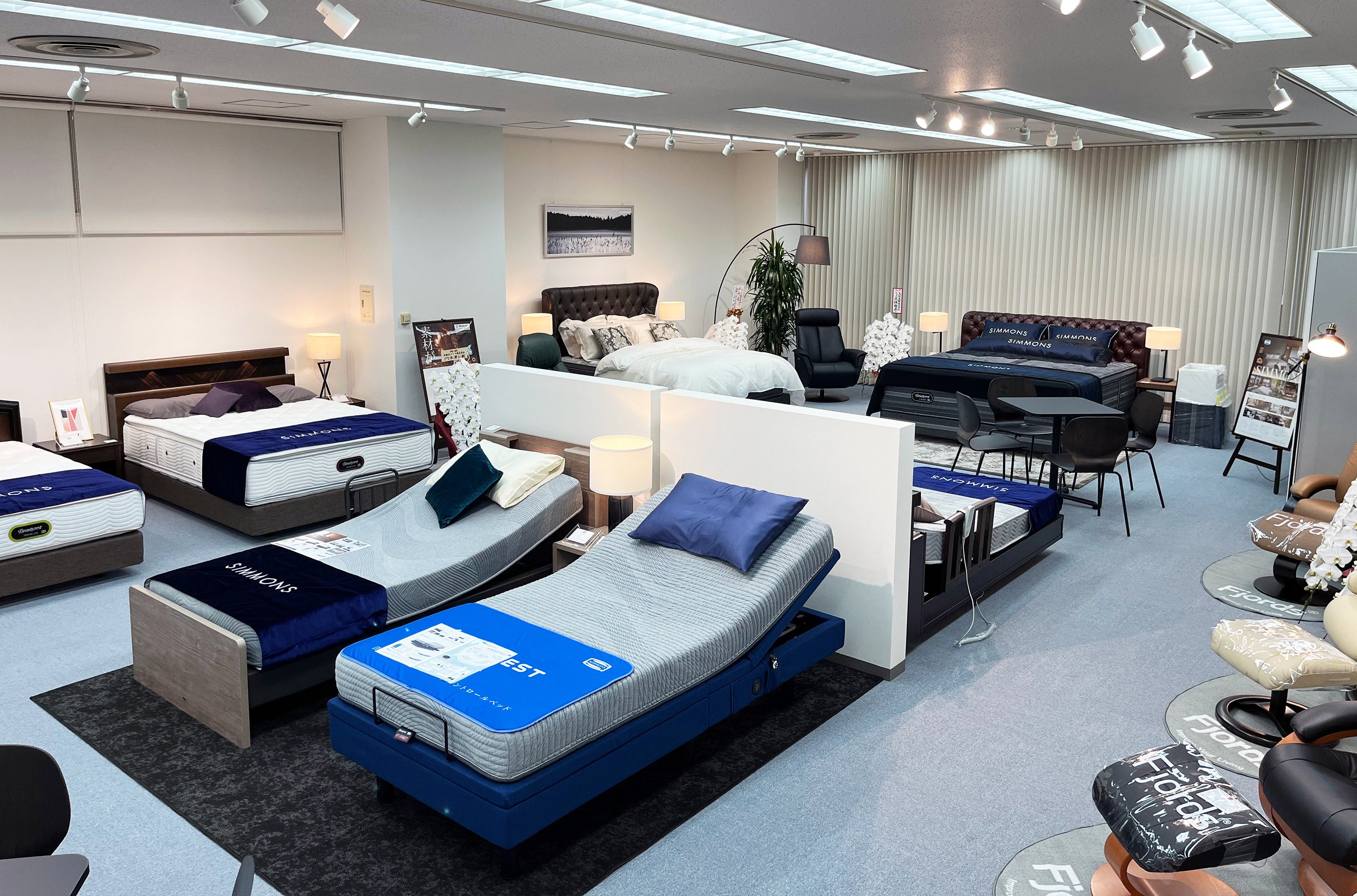 場所は、熊本市電と国道3号線が交差する水道町交差点の一角に位置する加地ビル、その1階。約78坪のスペースに、20台のシモンズ新作を一堂に展示、体験していただけます。あわせて、最適なマットレスを提案する新サービス、熊本地区限定マットレスもご用意しています。
