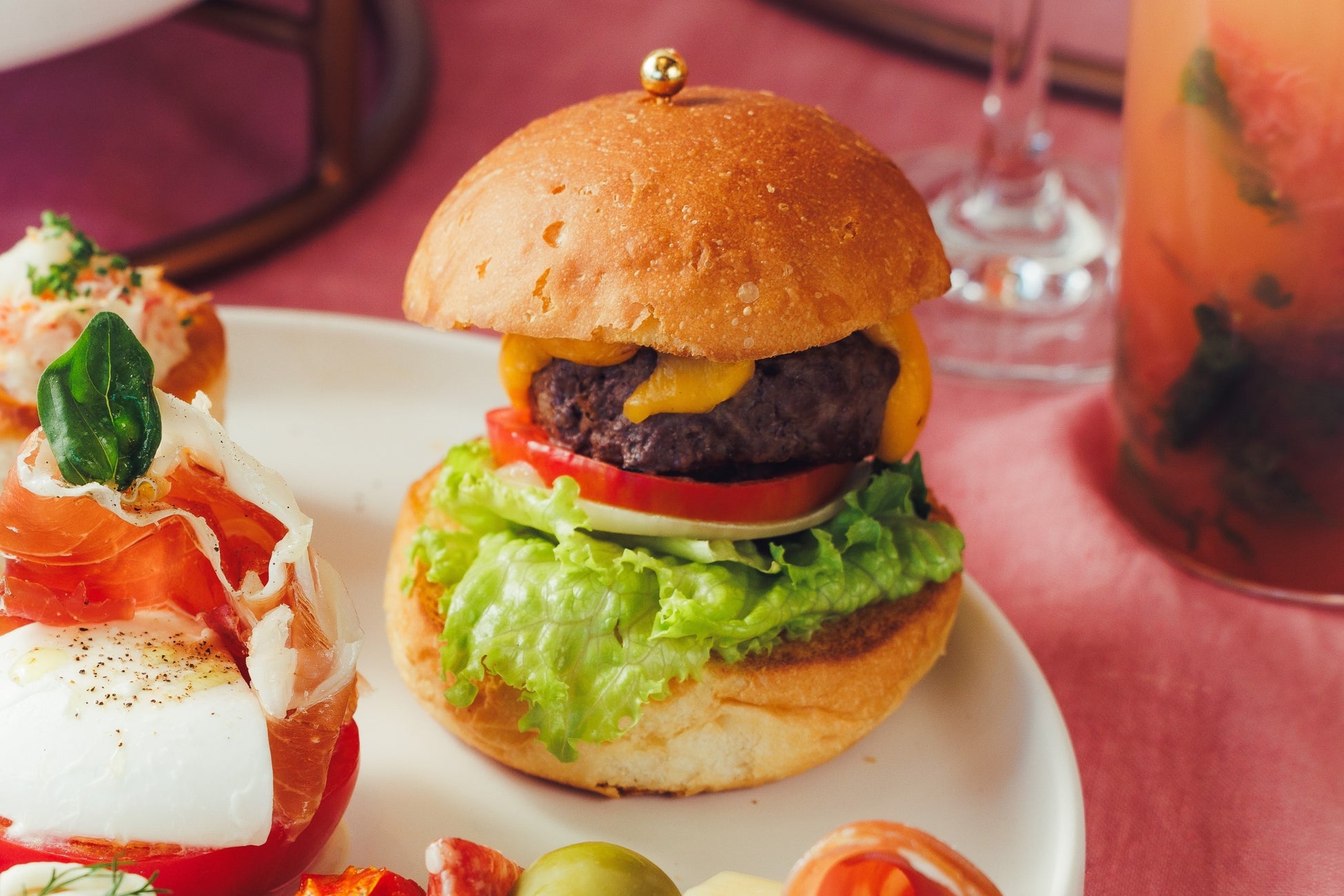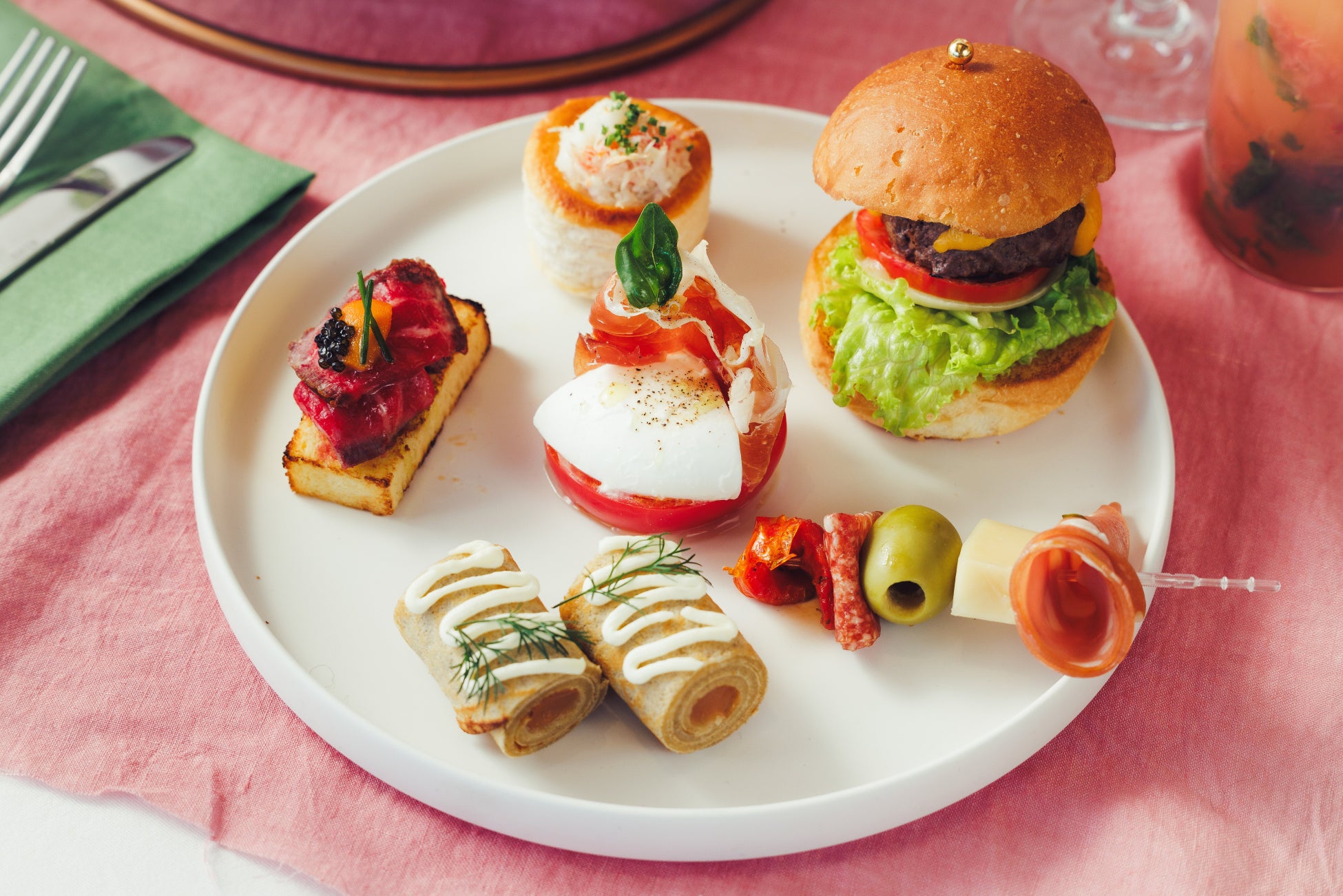 「Strawberry Afternoon Tea」では、旬のいちごをふんだんに使用したスイーツがラインナップします。いちごが丸々一粒のったロールケーキや、真っ赤なシュークリーム、人気のデザートのパンナコッタにいちごとラズベリーのソースを組み合わせたグラスデザートなどのスイーツ6種とともに、イル・ルピーノ・プライムが誇るUSDAプライムビーフ※のチーズバーガーや、シグネチャーメニューとしても人気の高いモッツアレラのカプレーゼ、ズワイガニのパイなどのセイボリー6種をご用意いたしました。お飲み物はドイツ生まれの最高級品質の「ロンネフェルト」の紅茶やコーヒー各種からお選びいただけます。またフレッシュストロベリーマティーニやノンアルコールモヒートなどのドリンクも登場し、飲み物までいちごづくしなひと時をお楽しみいただけます。