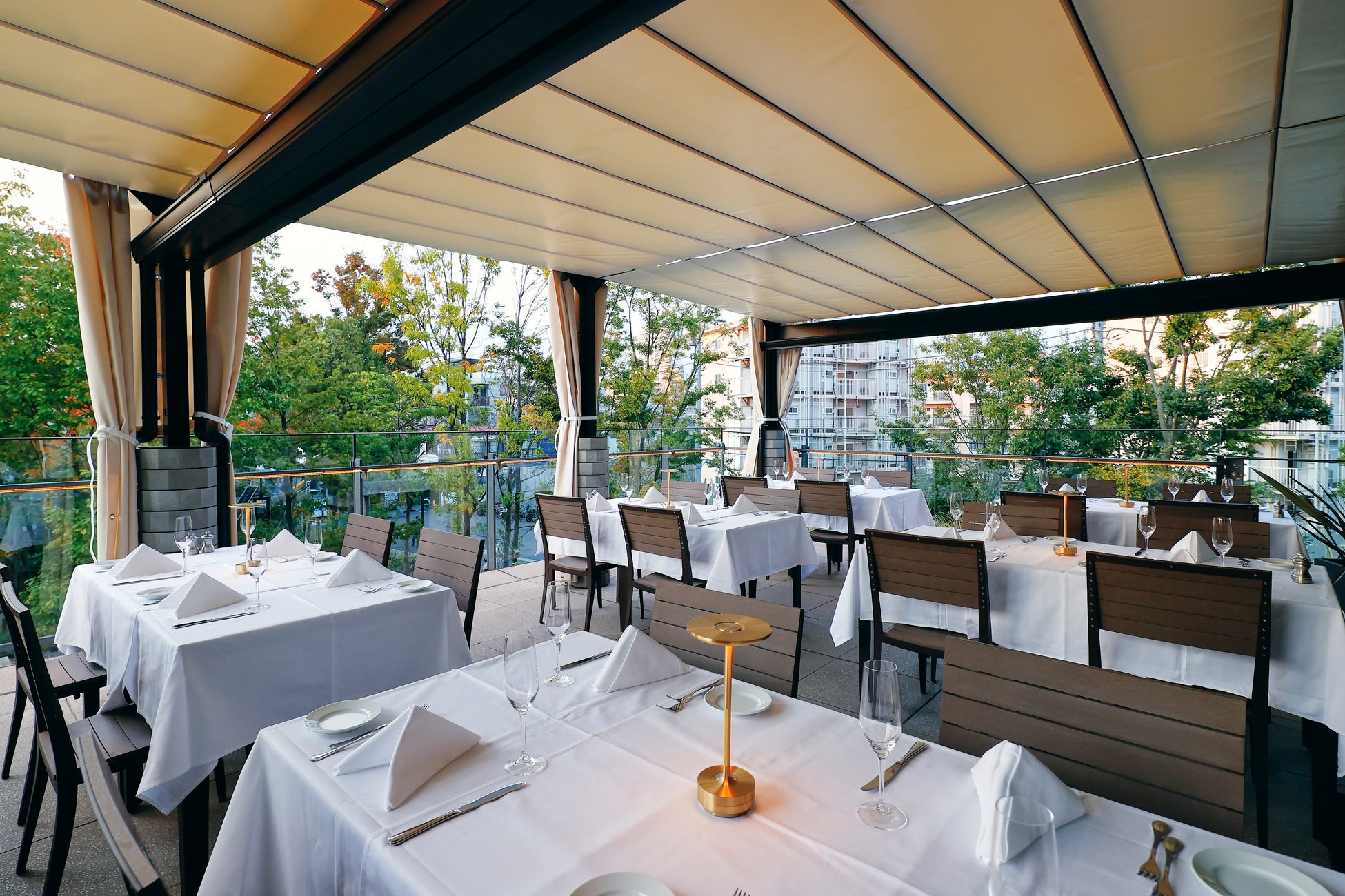 ペット同伴可のテラス席は四季折々の自然あふれる緑地を眺めながら、優雅な時間をお楽しみいただけます。ランチからディナーまで終日営業をしており、様々なシーンでご利用いただけます。