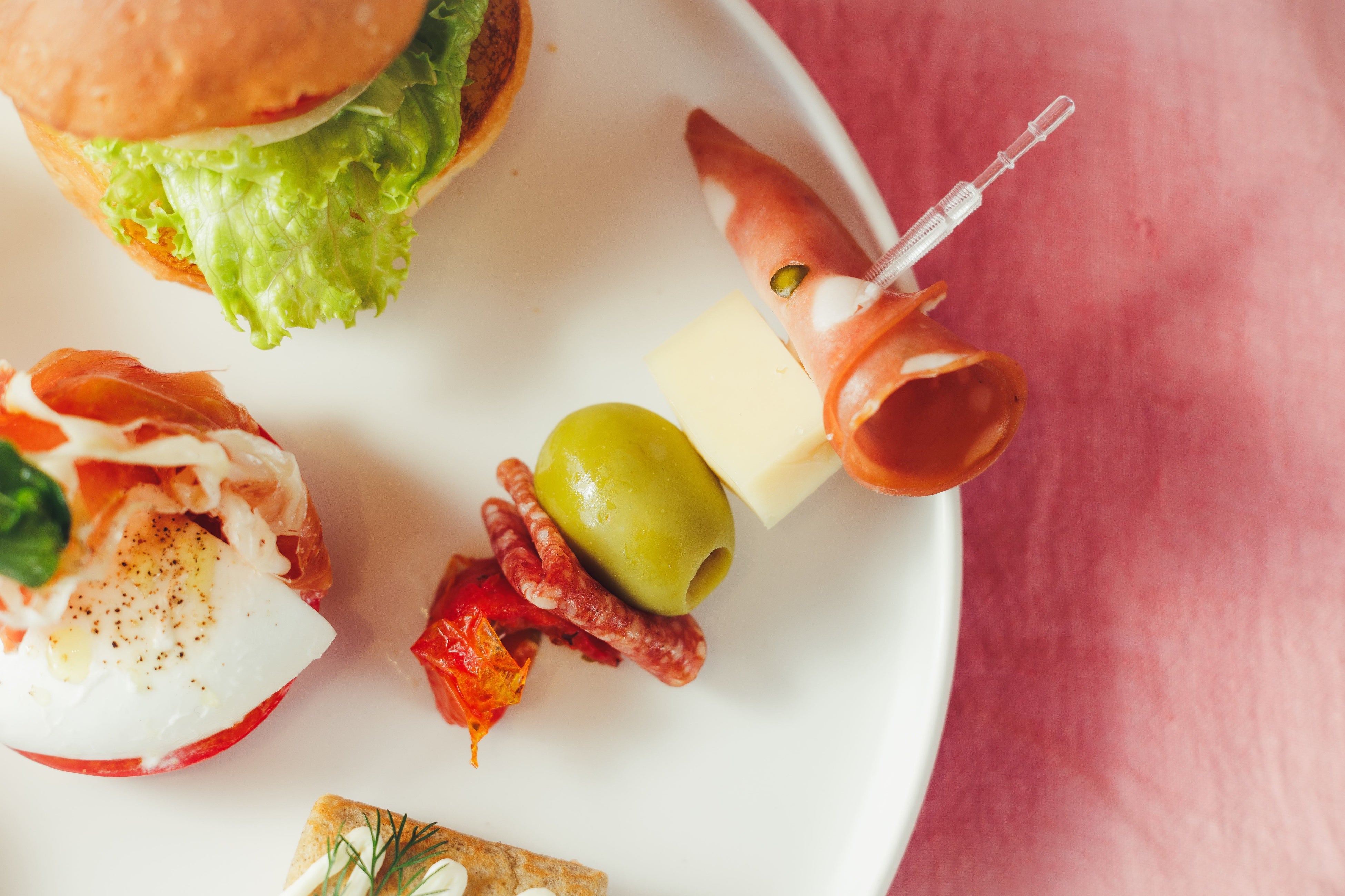 モルタデッラハム、フォンティナチーズ、オリーブ、サラミ、ドライトマトのピンチョスはお酒との相性も抜群です。
