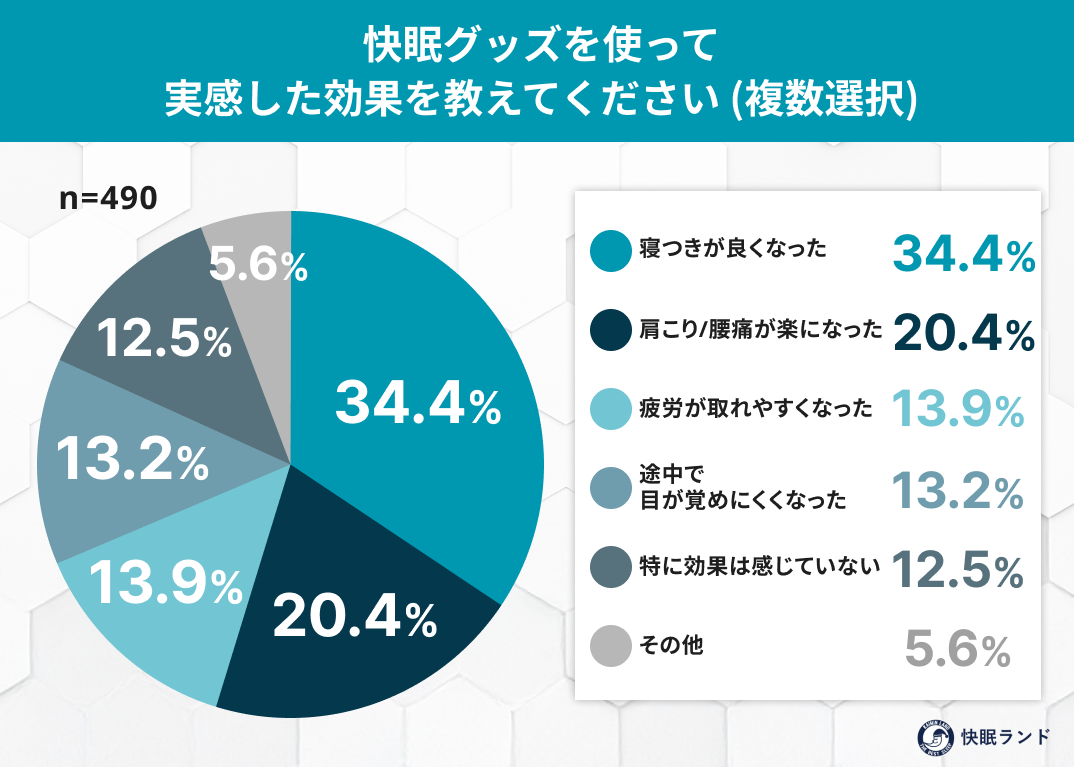 実際に使用した人のうち、最も多かったのは「寝つきが良くなった」(34.4%)。次いで「肩こり・腰痛が楽になった」(20.4%)、「疲労が取れやすくなった」(13.9%)。単なる睡眠サポートだけでなく、身体の回復にも効果を感じる層が多いことが特徴です。