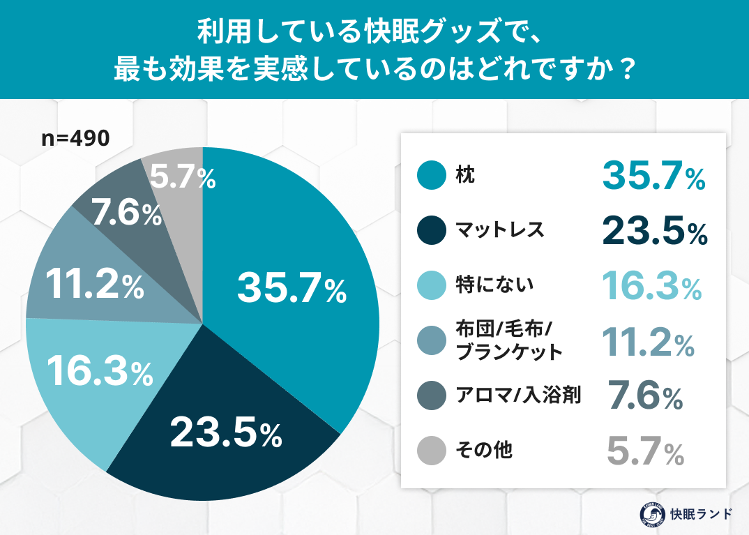 使用中の快眠グッズで効果を最も実感しているのは「枕」(35.7%)。続いて「マットレス」(23.5%)、「布団・毛布・ブランケット」(11.2%)。「特に効果を感じない」と答えた人は16.3%に留まり、約8割が何らかの快眠グッズ効果を実感していることがわかりました。