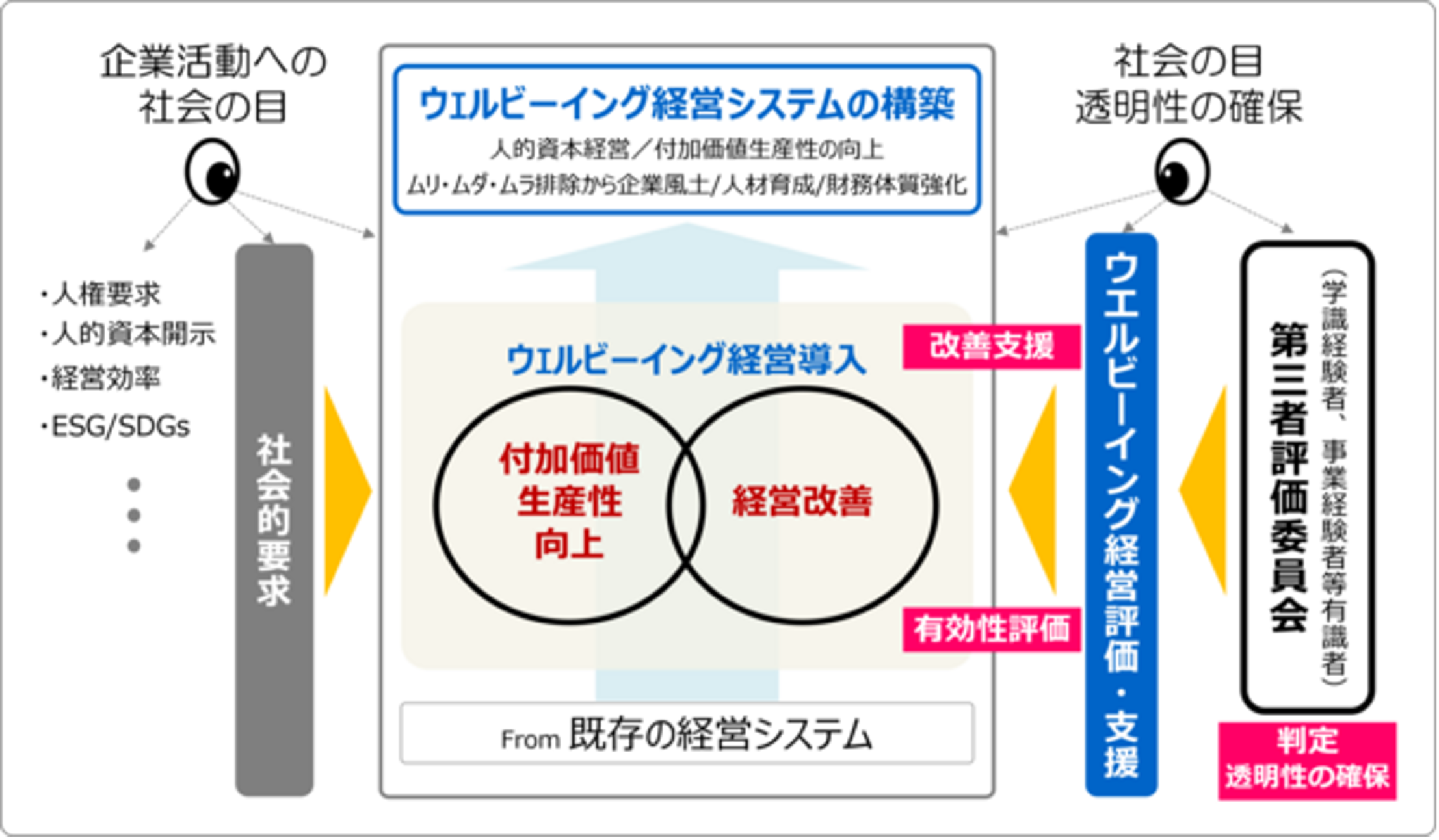 一般社団法人エコステージ協会が運営する「ウェルビーイング経営ステージ」は、ISO45001やISO30414などの国際規格を取り入れたマネジメントシステムを基盤に、社員とその家族の安全・安心・健康・幸福(Well-being)を経営の中心に据えた企業を段階的に評価する第三者認証制度です。認証取得の目的は単なる称号ではなく、PDCAサイクルに沿って組織の経営改善を促し、社員が長期的に活躍できる環境を整えることにあります。申請後は有資格の評価員が訪問調査や助言を行い、その結果を学識経験者等からなる独立した「第三者評価委員会」が審査し、妥当性が認められた場合にのみ認証が付与されます。