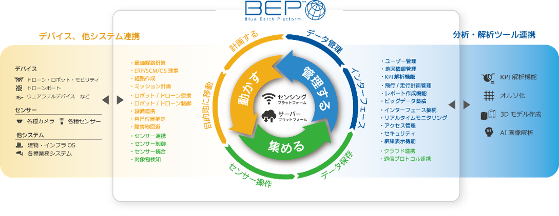 1999年6月設立。複数のドローン・ロボットを遠隔で制御し、統合管理するためのベースプラットフォーム「Blue Earth Platform®︎(BEP)」を軸に、以下ソリューションを開発・提供しています。