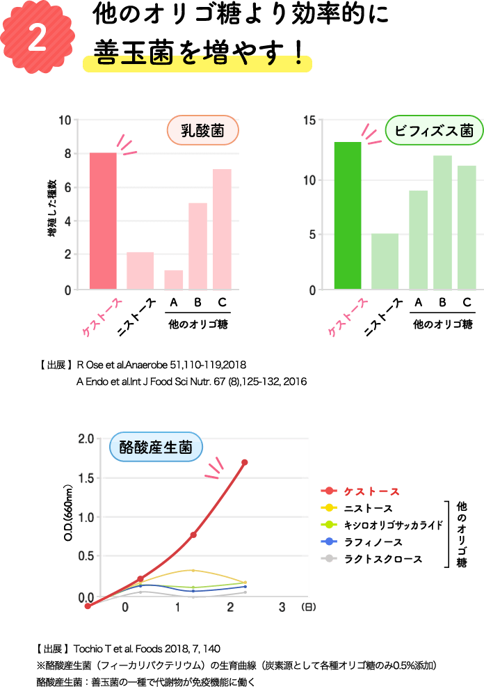 オリゴ糖は、善玉菌を増やす効果で、プレバイオティクスの中でも有名ですが、乳幼児期に摂りすぎると軟便・下痢につながることも。ケストースは、オリゴ糖の中でも善玉菌を増やす効果の高い成分を抽出したもので、少量でも善玉菌を増やす効果が確認されています。また、善玉菌だけに働き、悪玉菌などは増殖させないのもポイントです。
