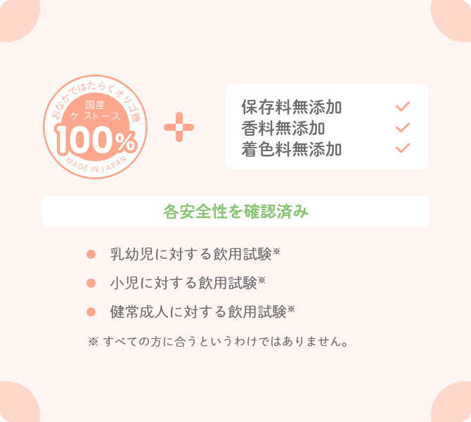 もともと食品に含まれるオリゴ糖の成分だから、赤ちゃんや妊娠中の方など、家族みんなで取り入れやすいのが特徴。生後1週間頃の赤ちゃんから飲めることを試験で確認しています(アレルゲン(28品⽬)含まず、乳児⽤規格適⽤⾷品)