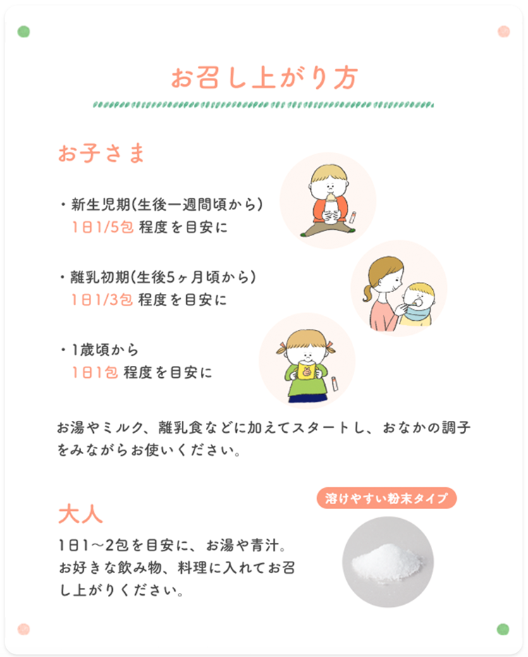 甘さ控えめの砂糖のようなほのかな甘みで、熱を加えても変性しません。ミルクや離乳食に混ぜたり、大人の方は飲み物やお料理に混ぜて、毎日続けやすい便利な食品です。