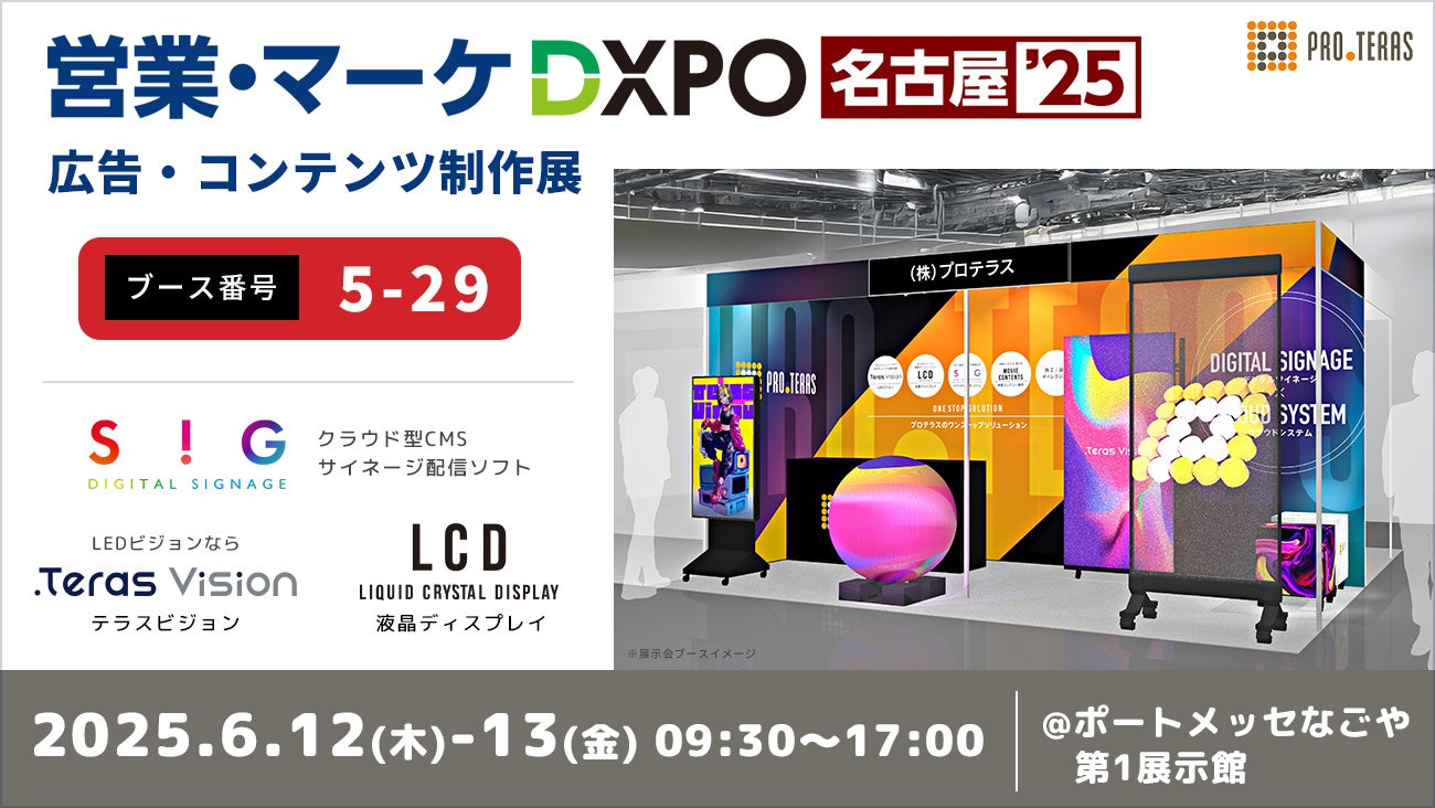 株式会社プロテラスは2025年6月12日(木)~13日(金)にポートメッセなごや 第1展示館で開催される「営業・マーケDXPO 名古屋'25 広告・コンテンツ制作展」に出展いたします。