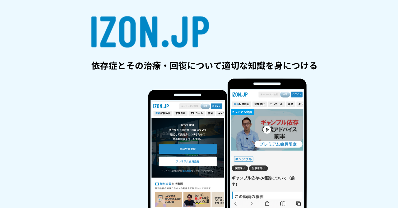 『IZON.JP』は、依存症(依存している状態)とその治療・回復について適切な知識を身につけるための会員制の動画スクールです。現場で活躍する精神保健福祉士や公認心理師、心理カウンセラーが監修する映像を、定額で、いつでもどこでも好きなだけ観て学んでいただけます。