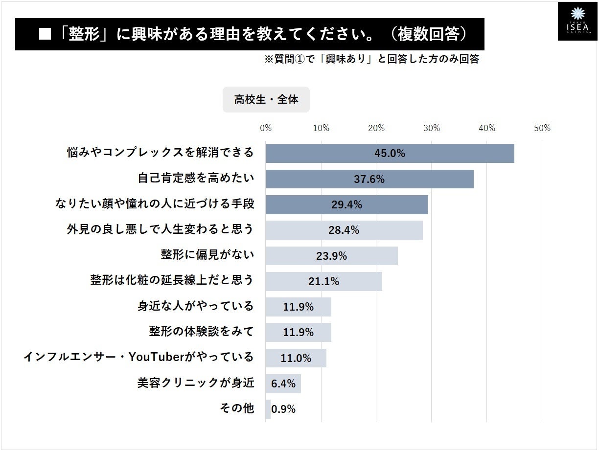 その結果、現役高校生の半数以上が「整形に興味がある(54.5%)」と回答。うち男女別の場合、女子高生においては約7割(69.0%)、男子高生も4割(40.0%)が興味を示していることが判明しました。また「整形に興味がある理由」に対しては、全体だとトップ回答に「悩みやコンプレックスを解消できるから(45.0%)」、次点に「自己肯定感を高めたい(37.6%)」があがりました。