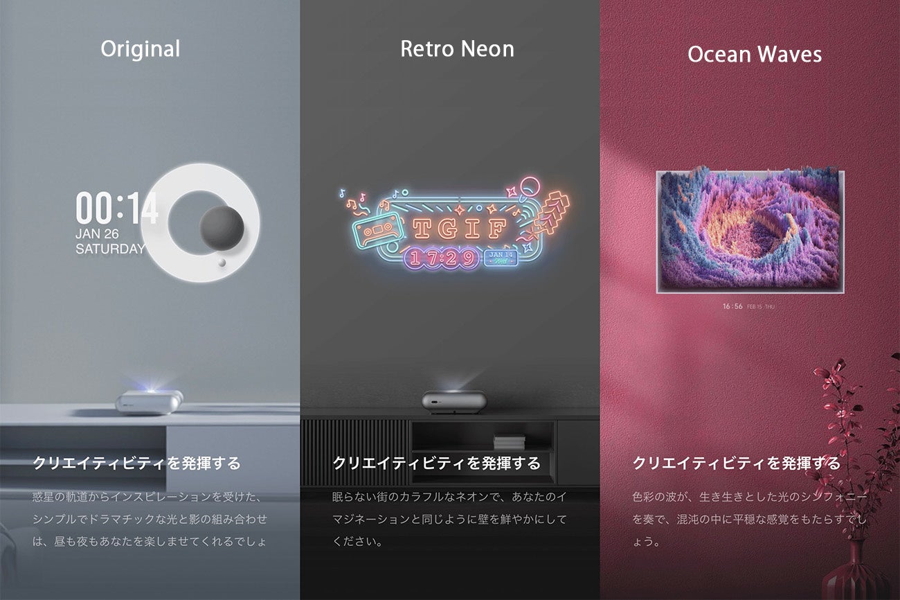 Luna OSのコンパニオンモードでは、3つのテーマのデジタルクロックを投影することができます。光や影の動き、華やかな色彩で部屋を彩ります。