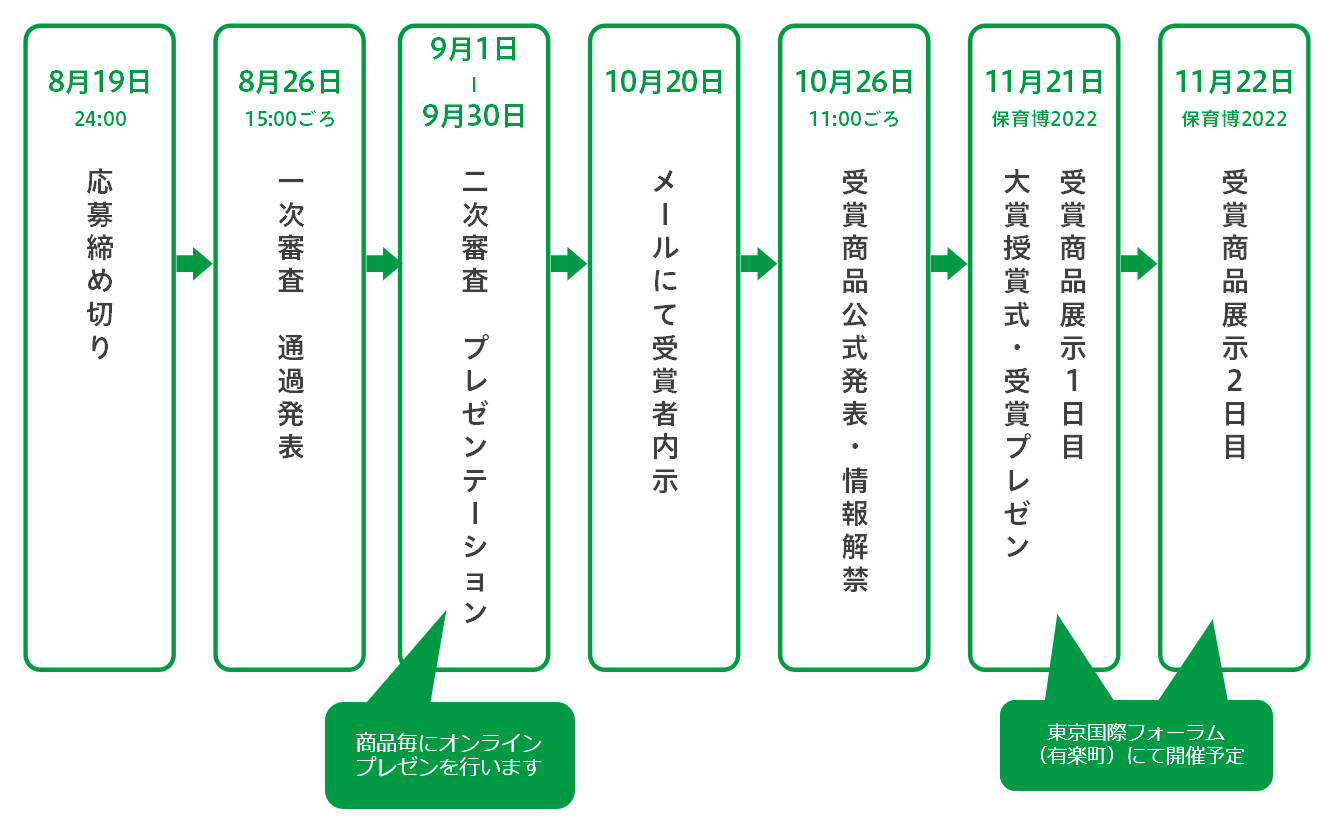 1次、2次審査を経て2022年10月26日に受賞商品を発表し、11月21日には東京国際フォーラムで開催される「保育博2022」内で大賞授賞式、受賞商品の展示を行います。