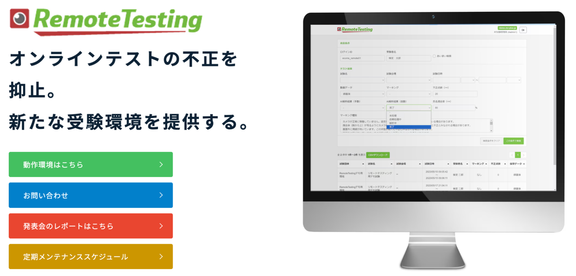 「Remote Testing」とは、オンラインテストの不正を抑止し、新たな受験環境を提供できるリモート監視サービスです。オンラインテストを厳正・厳格に行える試験専用のAIを活用したリモート監視ソリューションで、オンラインテストに「Remote Testing」を加えることで、会場型CBTと同等の受験環境をご提供します。