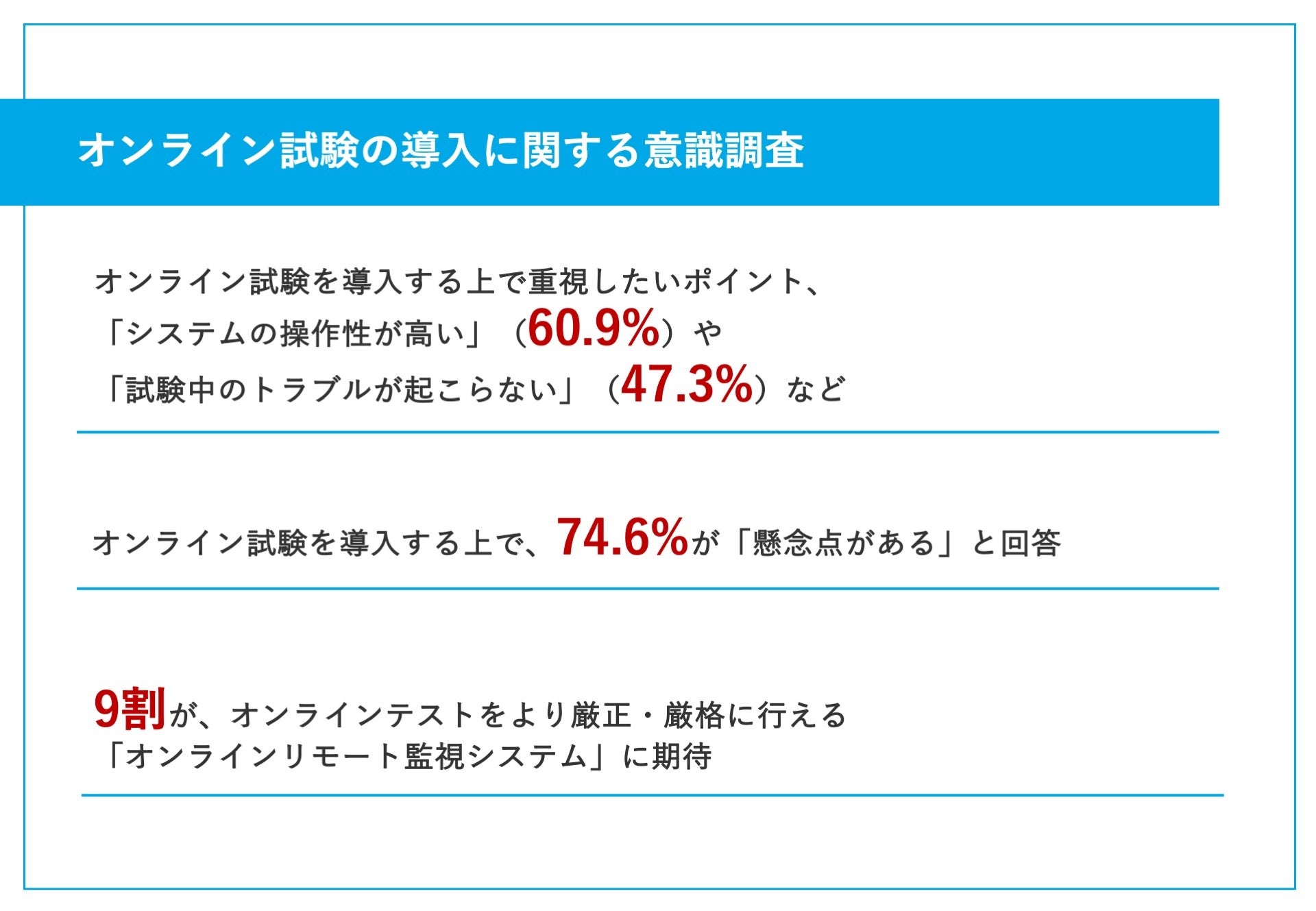 今回の調査では、オンライン試験の導入に関する実態が明らかとなりました。いつでも、どこでも受けられたり、紙の印刷費などが不要になる分、コスト削減にもなるなど、利点も明らかですが、多くの企業が、オンライン試験の導入にあたって、不正やトラブルなどの懸念を抱えていることがわかりました。オンライン試験を公正かつ安全に実施できるよう、不正をリモート監視するなどの多機能なサービスを検討してみてはいかがでしょうか。