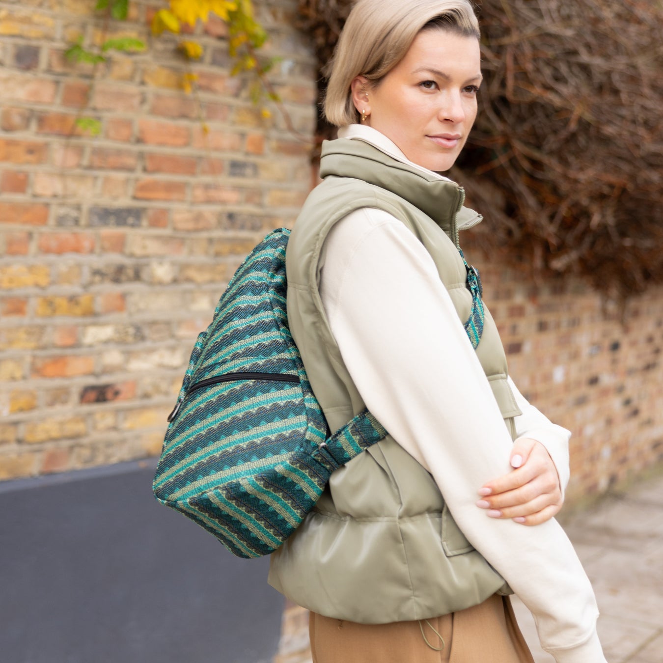 「スリング」シリーズで登場となる、2024AW限定モデル「エコウェーブ」。アパレル生産時に廃材として出る色とりどりの生地の端材や糸くずを再利⽤し、シースルーのキルティング⽣地に閉じ込めました。サステナブルな素材で作り上げた、ユニークで全く新しいデザインのヘルシーバックバッグです。