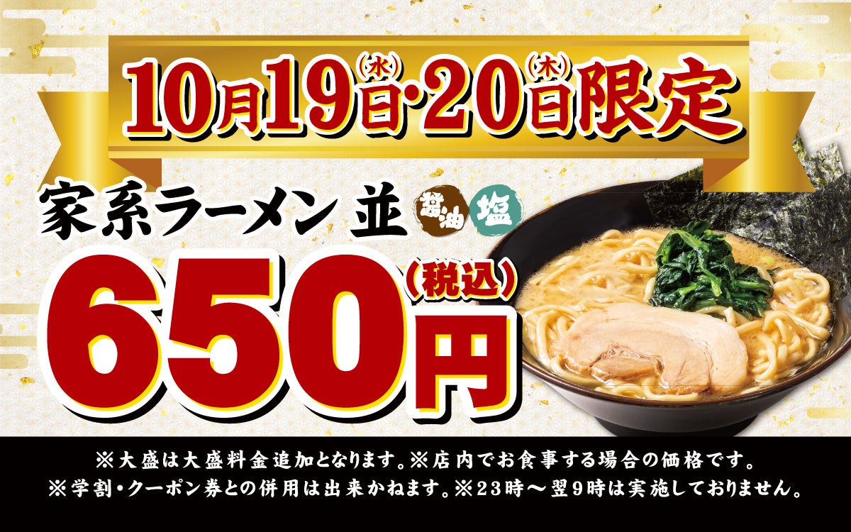 横浜家系ラーメンを提供する壱角家は、弊社ブランド化以来店舗数を増やし続け、100店舗を達成しました。現在も全国に壱角家を増やし続けています。また、2022年10月に季節の新商品情報や、お得なクーポンなどを提供する「横浜家系ラーメン壱角家公式アプリの登録者数」が15万人を突破しました。これらを記念して、2022年10月19日(水)と10月20日(木)の2日間限定で、ラーメン並を税込650円で販売します。ぜひ、お近くの壱角家へご来店ください。