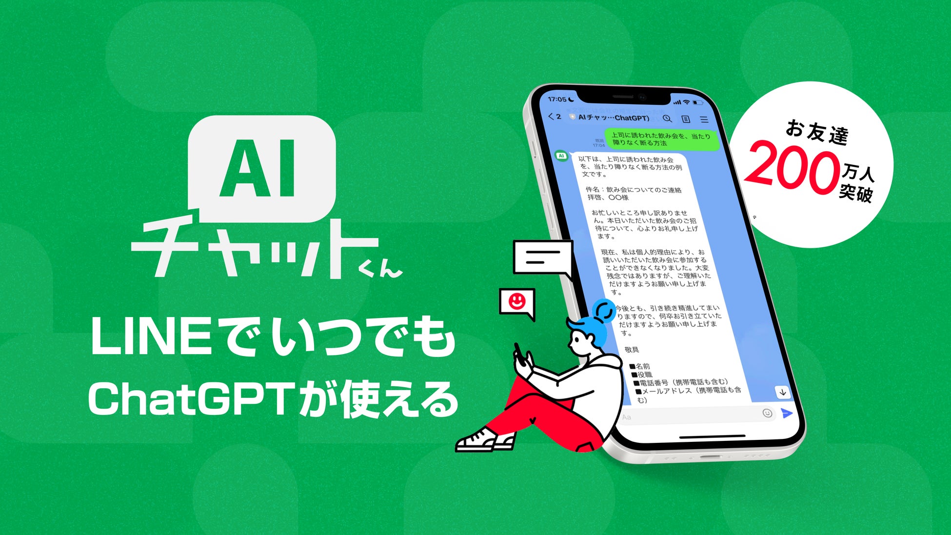 LINEで手軽に最先端のAIとチャットができるサービスです。友達追加するだけで会話をはじめることができ、献立作成からビジネスメールの作成、人生相談までなんでもチャットで答えてくれます。