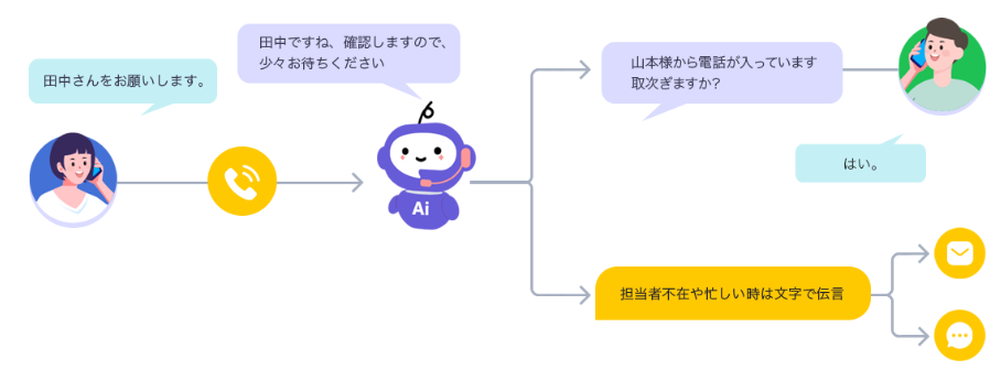 ミライAIは着信電話をそのまま直接転送することなく、転送先の担当者に繋げるかどうかの確認を行うStepがございますので、ご自身のご状況やご都合に応じて安心して判断を行うことができます。