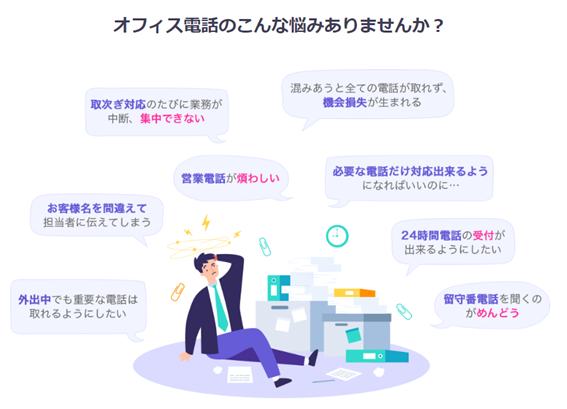 代表電話は社内の様々な方宛てに掛かってきますので、代表電話窓口担当の方や通常業務を行いながら代表電話を取る方は、伝達ミスや伝達漏れが発生したリ、取り次ぎに手間がかかったり、作業中の業務を中断して電話対応を行ったりと自身の業務に集中したくてもなかなか集中できないことがあると思われます。