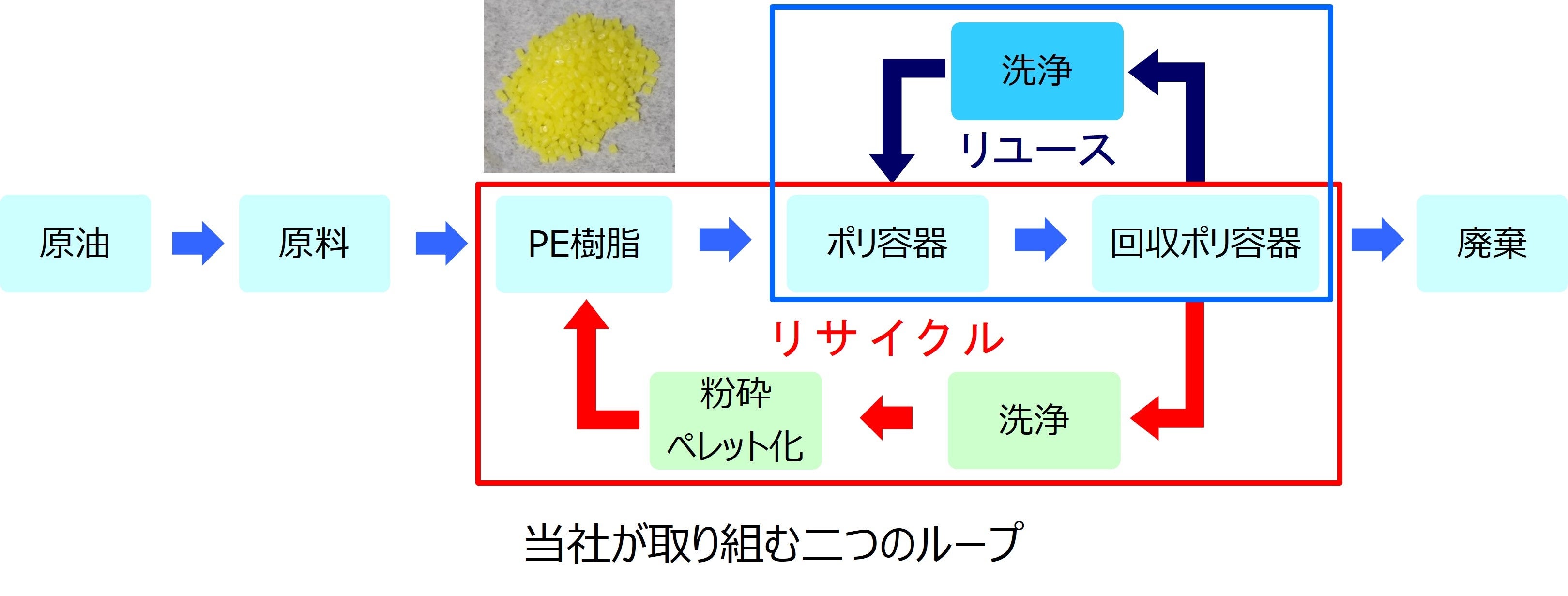 これまで当社では、ユーザーから使用済みポリエチレン容器を回収・洗浄し、再利用するリユースを長年行ってまいりました。しかし、回収された容器には、汚れや長期使用によりリユースできず廃棄されるものが一定数あります。本取り組みにより、この廃棄される容器が少なくなり、持続可能な社会の実現により貢献できます。