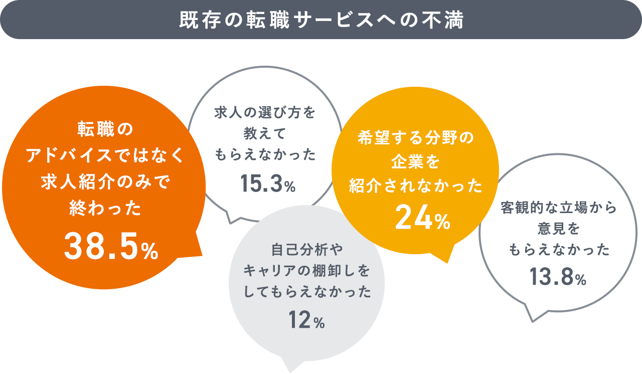 弊社が2022年2月に実施したインターネット調査によると、既存の転職サービスを利用した38.5%の人が「求人紹介だけでなく転職のアドバイスもして欲しい」という願望を持っている事が分かっています。