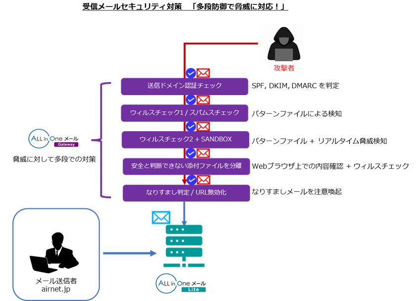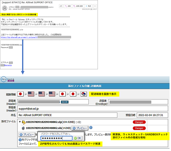 「ALL in OneメールLite」では、徹底した受信メールセキュリティ対策を行う「ALL in Oneメール Gatewayセキュリティプラス」https://www.airnet.jp/gate/aioplus/ と組みわることで送受信メールのトータルでのセキュリティ対策も可能になります。「スパムメールフィルタ」、「2段階のウィルスメールフィルタ」と「SANDBOXによるリアルタイム解析」に加えSANDBOXが安全と判断できなかった添付ファイルを本文から分離し、受信者にWeb画面での安全確認を強制化します。こちらによりZIP暗号化した添付ファイルからマルウェア「Emotet」などへの感染を狙うメールを遮断することができます。