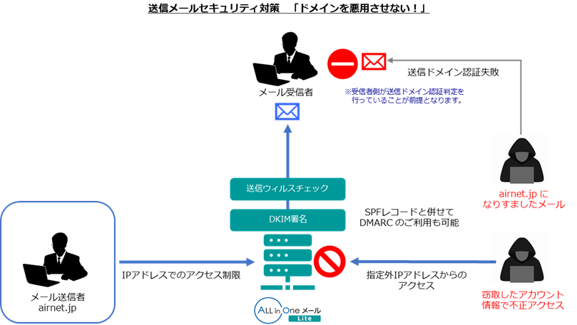 株式会社エアネット (本社:東京都品川区、代表取締役社長:吉村 隆 ) は、共用型メール専用サービス 「ALL in OneメールLite」https://www.airnet.jp/aiolite/ の標準機能としてなりすまし対策(DKIM)設定機能を実装しました。