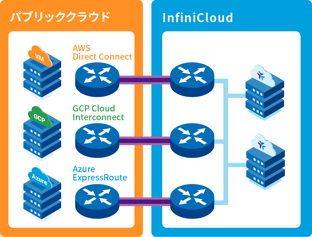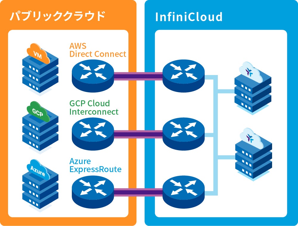 また、当社のPublic Cloud Link を利用してパブリッククラウドと L3 で IP 接続することで、単価が安く定額な InfiniCloud のプライベートクラウドと各クラウドの独自機能を同時に活用することができます。