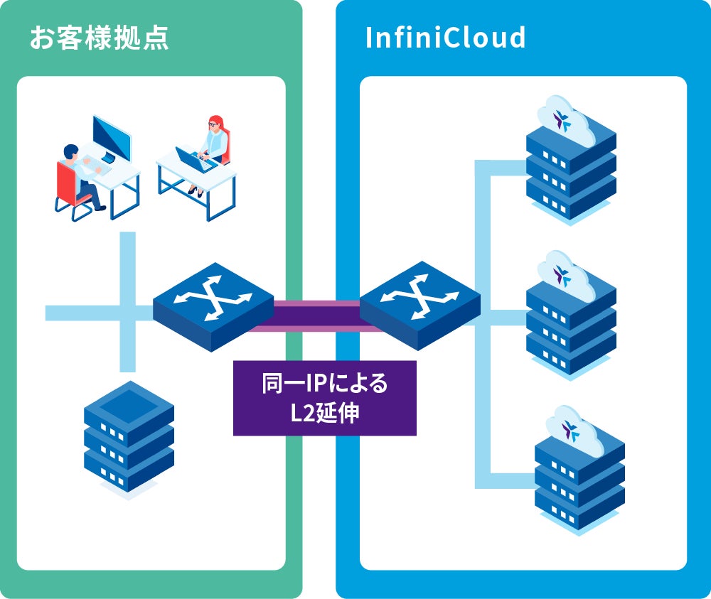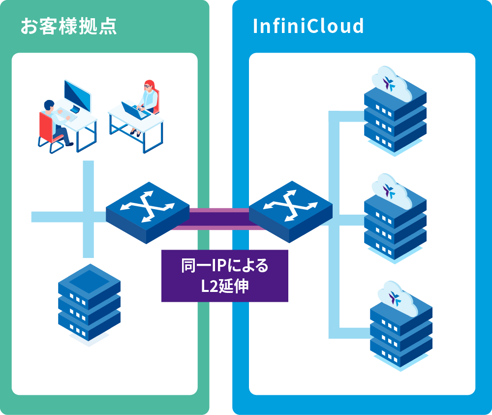 InfiniCloudのPrivate Connectは、L2で接続されるため、既存のオンプレミスがあるデータセンターやオフィスから、同じセグメントやVLANをそのままクラウドに延伸することができます。様々なP2V/V2Vツールを使って、最小のダウンタイムでサーバーをオンプレミスからクラウドに移行できます。