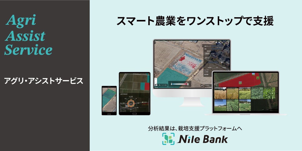 圃場や作物の生育状況を分析・シミュレーションし、品種・地域・土質に応じた栽培体系の確立を支援する「アグリ・アシストサービス」を紹介します。スマート農業をワンストップで支援し、生育分析結果は栽培支援プラットフォーム「NileBank」に集約可能です。圃場のどこに、何があるかを視覚化します。