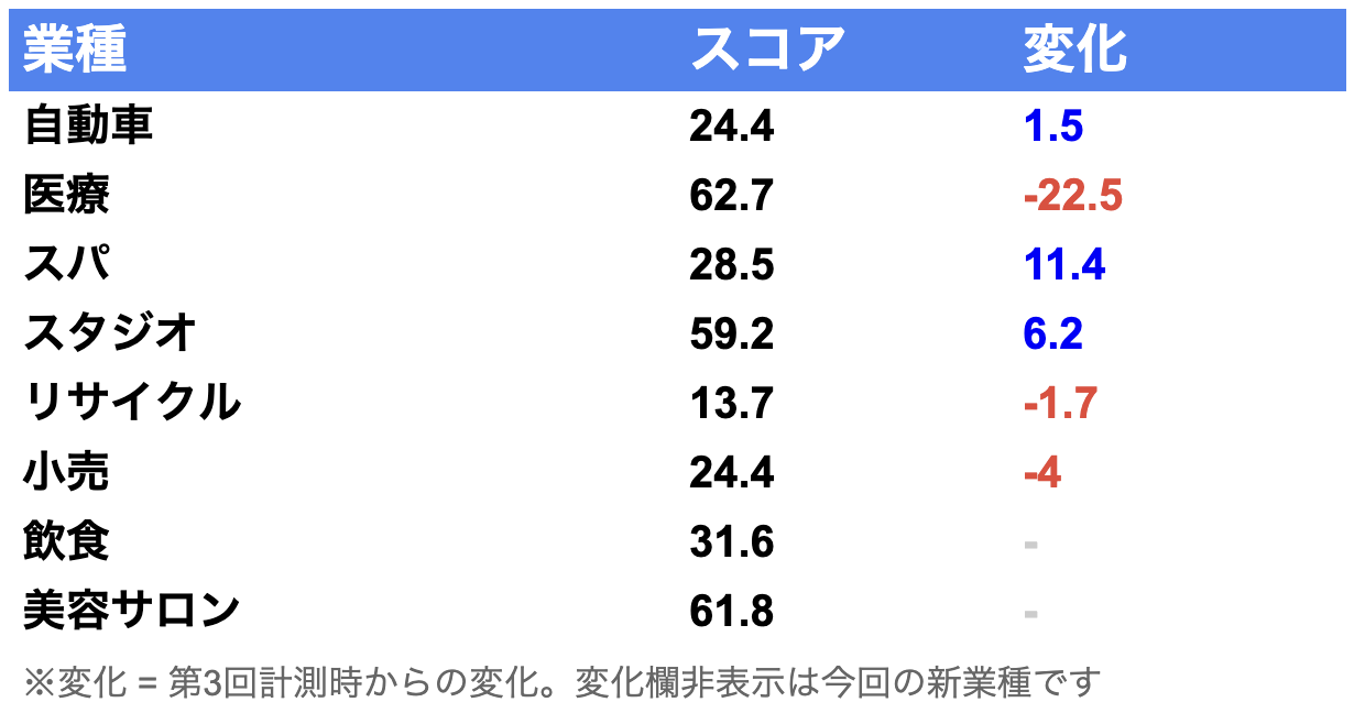今回、第3回からの変化が大きかったのが、スパ、及び医療業界でした。各店舗ごとに変動の理由はそれぞれに存在しているため具体的な言及は難しいですが、高評価・低評価が入る際には全体的に以下の傾向が見られました。