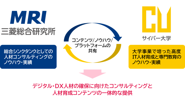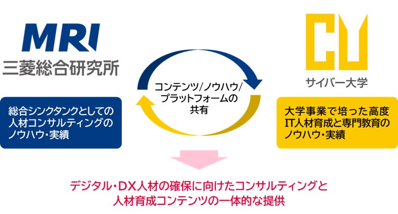 こうしたこれまでの取り組みを踏まえ、このたびMRIとサイバー大学は、デジタル・DX人材の確保に向けたコンサルティングと人材育成コンテンツの一体的な提供を目的とし、包括的な業務提携に向けて検討を開始しました。