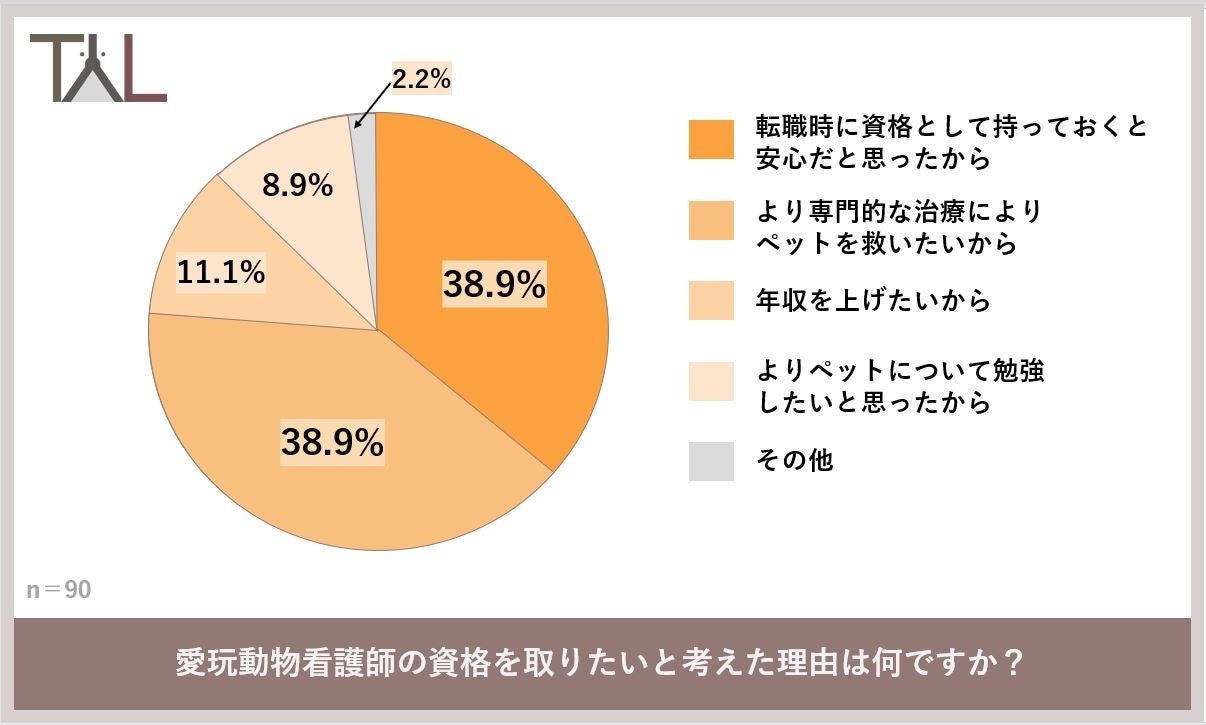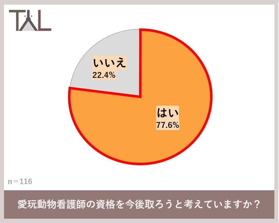 動物看護スタッフ116名に対し、「愛玩動物看護師の資格を今後取ろうと考えていますか?」と質問したところ、77.6%の人が「はい」と回答し、今後資格を取ろうと考えていることが分かりました。資格を取りたいと思う理由の1位は「転職時に資格として持っておくと安心だと思ったから」「より専門的な治療によりペットを救いたいから」が同率で38.9%、3位は「年収を上げたいから」で11.1%、その他フリーアンサーでは「国家資格が欲しいから」「取らないと業務に支障がでるため」といった回答でした。