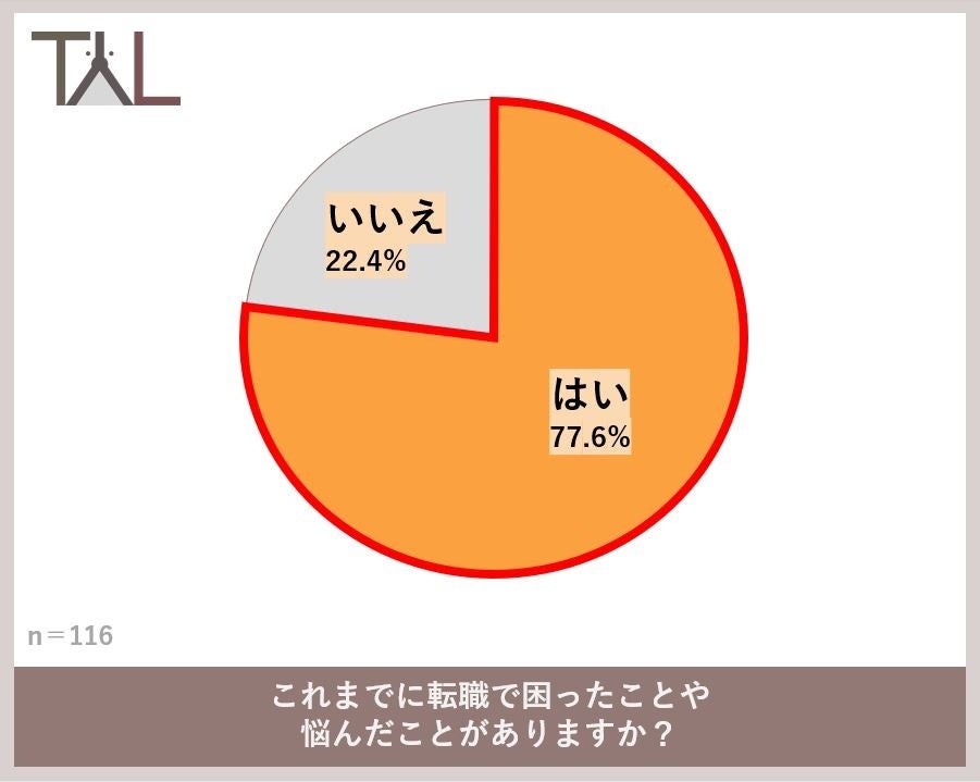 ・転職で悩んだことがある人は約8割。仕事の悩みについては、1位「給与が低い」、2位「人間関係」、3位「将来への不安」という結果に。
