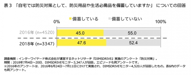 - 災害のため備蓄している人は2年前と変わらず、5割以下