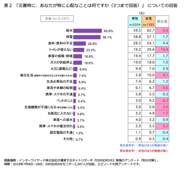 男女差に注目すると、4位の「トイレが使えない」で最も差が大きく、女性では男性を10.4pt上回って、29.6%と3割。男性では「家屋の損傷・倒壊」よりわずかに低く5位ですが、女性では「食料・飲料の不足」より5.5pt高く、3位にアップしています。