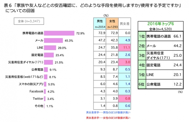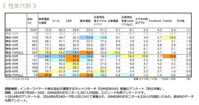 反対に、「LINE」「Twitter」は、若年層の特に女性で高くなっていました。性別や年代による通信手段の違いは、災害時、情報格差の元になるかもしれません。