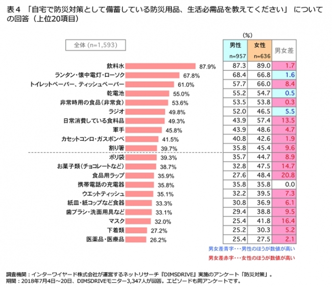 男女差に注目すると、ほとんどの項目で女性のほうが高くなっていました。男女差が最も大きかったのが「食品用ラップ」(20.8pt差)、次いで「マスク」(16.4pt差)、「お菓子類(チョコレートなど)」(14.7pt差)、「日常消費している食料品」(13.5pt差)となっています。一方、男性のほうが女性より高かったのは「ラジオ」 (5.5pt差)、「ランタン・懐中電灯・ローソク」(1.6pt差)、「乾電池」(0.5pt差)でした。男性は非常時に備える気持ちが強く、女性は被災後のさまざまな生活シーンを想定して備蓄しているように思えます。