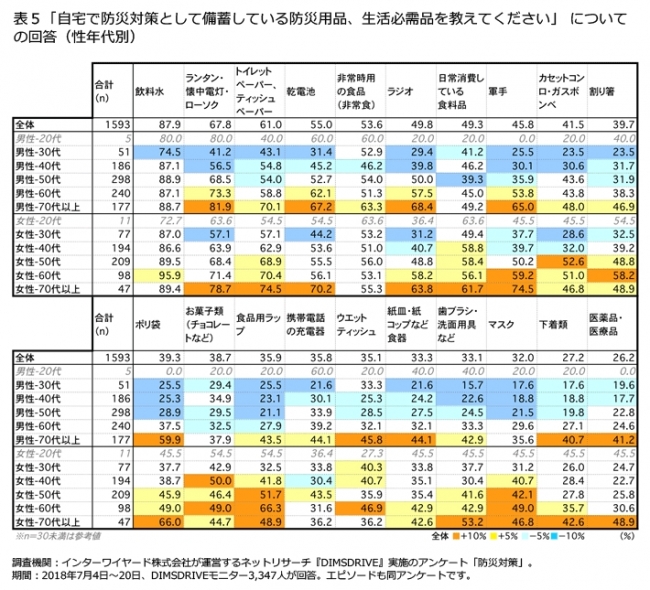 また、たとえば「ランタン・懐中電灯・ローソク」は、最も数値が高かったのが70代以上男性の81.9%で、最低だった30代男性の41.2%とは40.7ptも差があります。「ラジオ」も、男性の70代以上では68.4%、30代では29.4%で、その差は39.0pt。「ランタン・懐中電灯・ローソク」や「ラジオ」は日常の生活でも若年層には縁遠く、災害時に使うシーンが想像しにくいとも考えられそうです。
